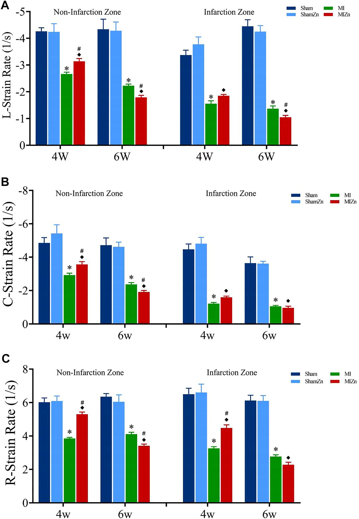 Strain rate peak values in the longitudinal (A), circumferential (B) and radial (C) directions of myocardial infarction zone and non-infarction zone in eight groups, L: Longitudinal, C: Circumferential, R: Radial. All of the data were shown as Mean ± SEM. *p < 0.05, MI vs. Sham; ◆p < 0.05, ShamZn vs. MIZn; #p < 0.05, MIZn vs. MI.