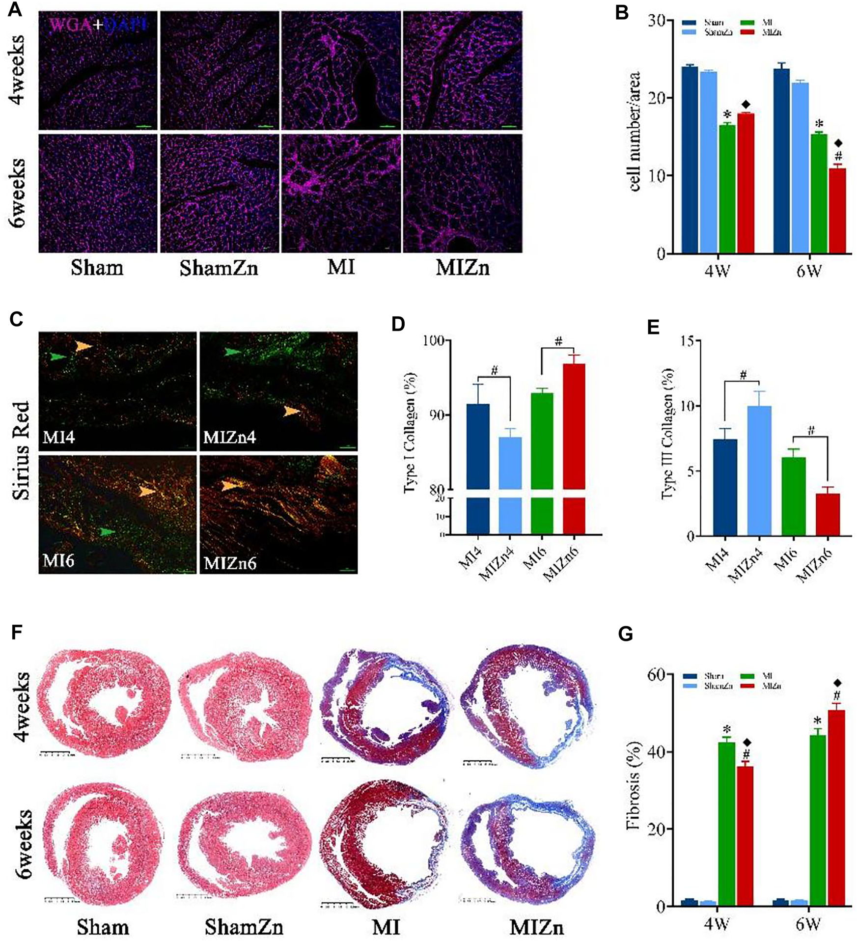 Representative diagrams of WGA + DAPI redyeing (A) and statistical results of myocyte number per unit area (image magnification: 200 and scales: 50 µm) (B); Representative diagrams of Sirius red staining (C) and statistical results of type I collagen (yellow) (D) and type III collagen (green) (E). Schematic panoramas of Masson staining (F) and statistical results of myocardium fibrosis (scales: 2.5 mm) (G). All of the data were shown as Mean ± SEM. *p < 0.05, MI vs. Sham; ◆p < 0.05, ShamZn vs. MIZn; #p < 0.05, MIZn vs. MI.