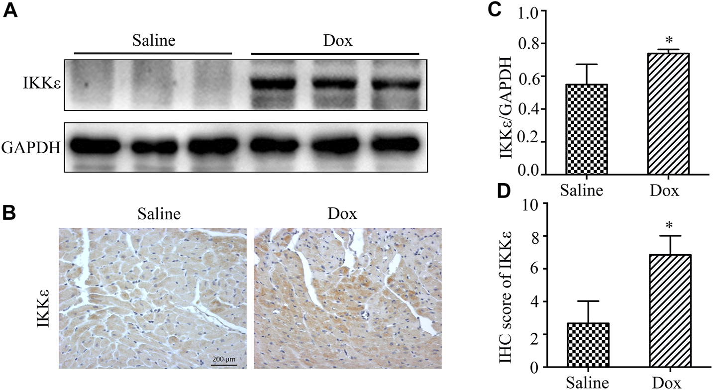 The expression of IKKε was increased in WT mice’ hearts after injection of Dox (A). Representative western blot showing expression of IKKε in heart tissue after Dox injection (n = 4 mice per experimental group). (B). Representative images of IHC staining of IKKε in WT mice’ hearts after Dox injection (n = 4 mice per experimental group, 400x; vs. Saline, *p < 0.05). (C). Quantitative analyses of western blot of IKKε (vs. Saline, *p < 0.05). (D). Quantitative analyses of IHC of IKKε (vs. Saline, *p < 0.05).