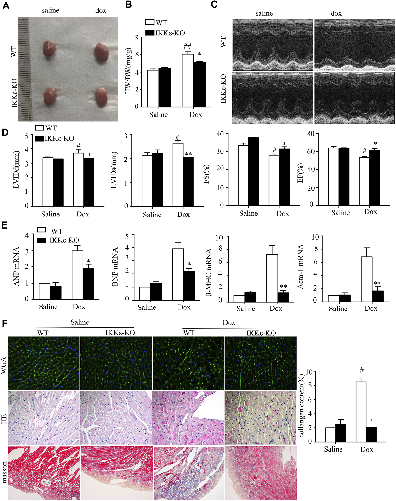 Deficiency of IKKε attenuated the development of Dox-induced dilated cardiomyopathy. (A). Representative images of the hearts of WT and IKKε-KO mice. (B). The ratio of heart weight/body weight between WT and IKKε-KO mice under Dox stimulation (n = 6 mice each group in HW/BW; vs. Saline or WT Dox, *p < 0.05) (C,D). Representative images and parameters of echocardiography (LVIDd, LVIDs, FS, and EF) of WT and IKKε-KO mice injected with saline or Dox (n = 6 mice per experimental group; vs. Saline or WT Dox, *p < 0.05). (E). The mRNA analysis of markers of heart failure (ANP, BNP, Acta-1, and β-MHC) in the heart of WT or IKKε-KO mice after Dox injection (n = 4 mice per experimental group; vs. Saline or WT Dox, *p < 0.05). (F). Representative images of WGA staining, HE staining and Masson staining of WT and IKKε-KO mice (n = 4 mice per experimental group, 400x for HE and WGA staining; 200x for Masson). The small arrows in HE refer to the changed nuclei after doxorubicin stimulation. Analysis of collagen content of WT and IKKε-KO mice (n = 4 mice per experimental group, vs. Saline or WT Dox, *p < 0.05).