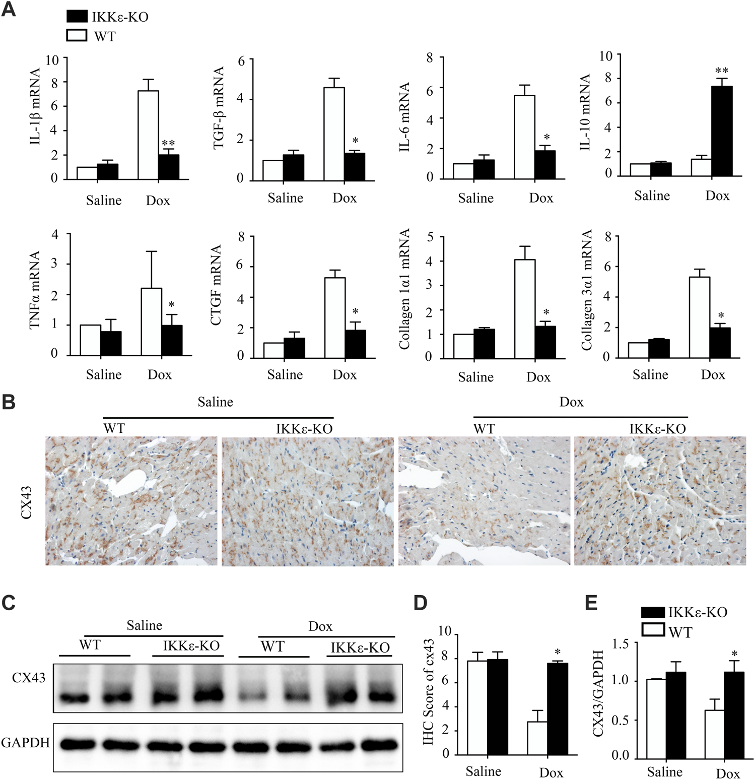 IKKε knockout relieved heart failure, fibrosis, inflammation, and destruction of gap junction structure after Dox induction. (A). The mRNA analysis of markers of Inflammatory cytokines (IL-6, IL-1β, TNF-α, and IL-10), and collagen-related factors (CTGF, TGF-β1, Collagen 1a1, and Collagen 3a1) in the heart of WT or IKKε-KO mice after Dox injection (n = 4 mice per experimental group; vs. Saline or WT Dox, *p < 0.05). (B,D). Representative IHC images and analyses of Cx43 in the heart tissues of WT and IKKε-KO mice after Dox stimulation (n = 4 mice per experimental group, 400x, vs. Saline or WT Dox, #p/*p < 0.05). (C,E) Representative western blot images and analysis of Cx43 in heart tissue after Dox injection (n = 4 mice per experimental group, #vs. Saline or WT Dox, p/*p < 0.05).