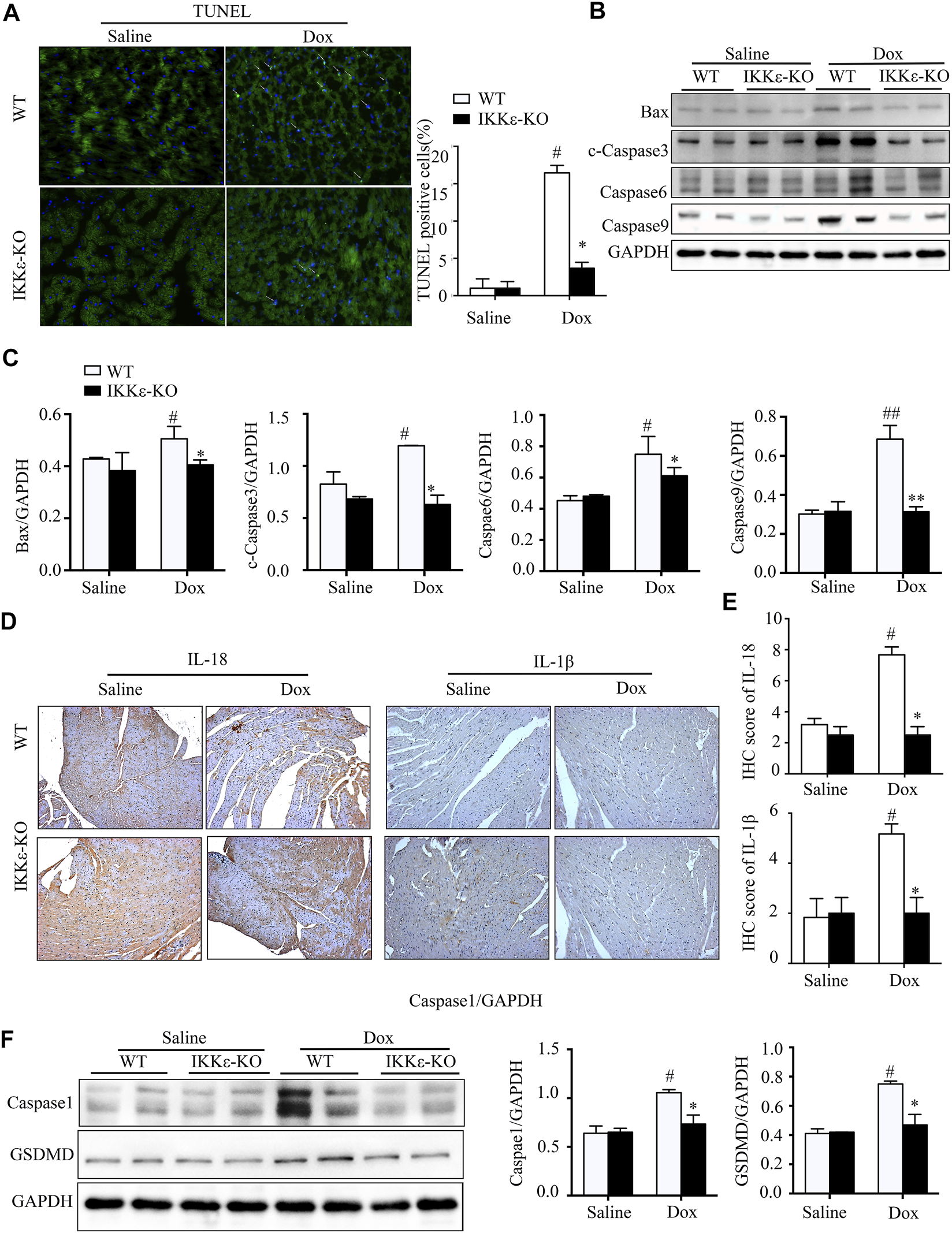 IKKε knockout ameliorated pyroptosis and apoptosis in myocardial tissue after Dox stimulation. (A). Representative figures and analysis of TUNEL staining of tissue from WT and IKKε-KO mice after Dox injection (n = 4 mice per experimental group, vs. Saline or WT Dox, #p/*p < 0.05). (B,C). The western blotting images and analysis of apoptosis-related proteins in the heart tissue of WT and IKKε-KO mice injected with Dox for 30 days (n = 4 mice per experimental group, vs. Saline or WT Dox, #p/*p < 0.05). (D,E). Representative Immunohistochemistry images and analysis of IL-18 and IL-1β in the heart tissues of WT and IKKε-KO mice after Dox injection (n = 4 mice per experimental group, 200x, vs. Saline or WT Dox, #p/*p < 0.05). (F). Representative western blot images and analysis of proteins associated with pyroptosis in heart tissue of WT and IKKε-KO mice injected with Dox for 30 days (n = 4 mice per experimental group, vs. Saline or WT Dox, #p/*p < 0.05).
