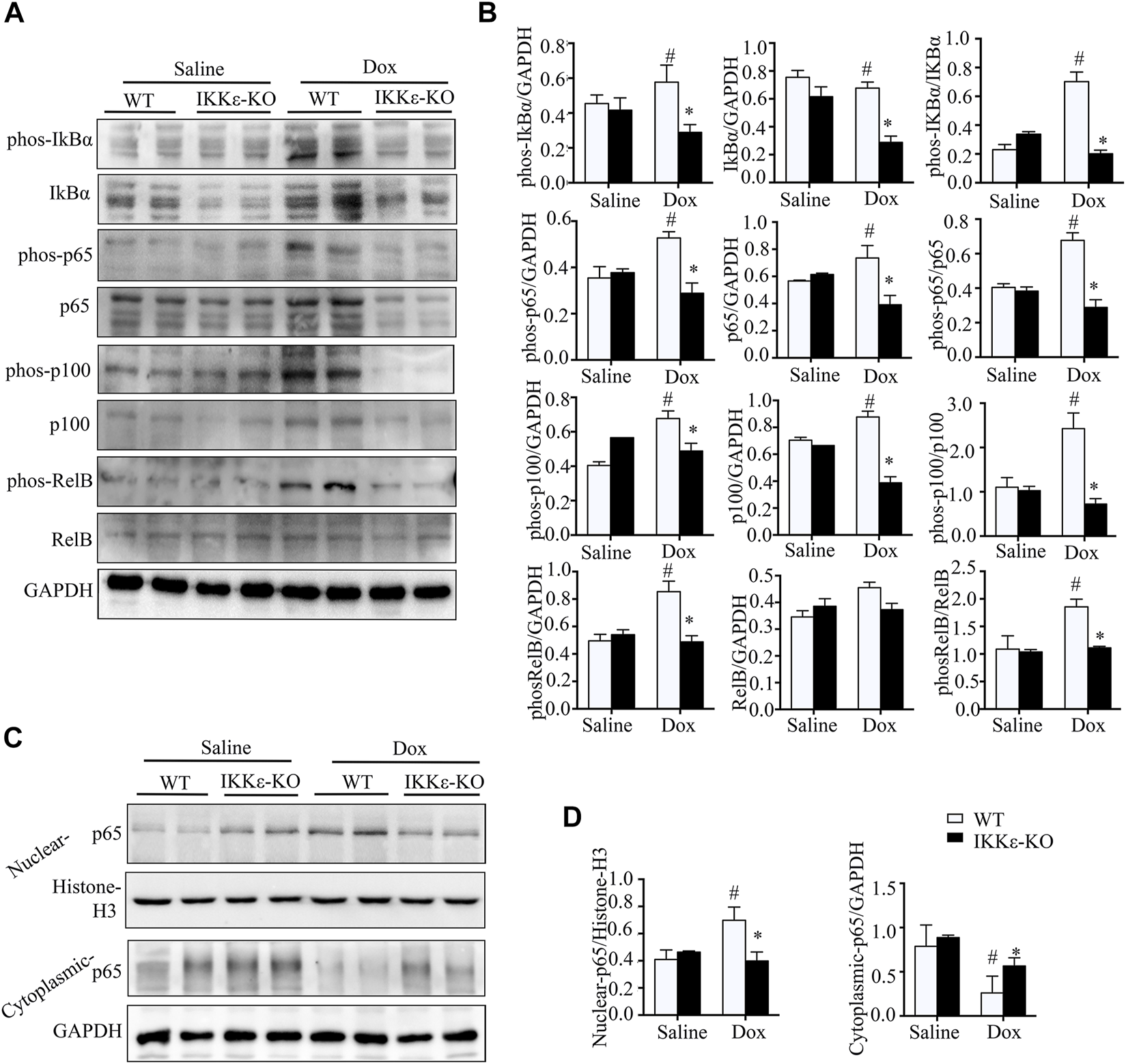 IKKε knockout inhibited the NF-κB signaling pathway in Dox-induced DCM. (A). Representative western blots showing total protein and the phosphorylation levels of IκBα, RelB, p65, and p100 in the NF-κB pathway in heart tissues of WT and IKKε-KO mice injected with Dox (n = 6 mice per experiments). (B). Quantitative analysis of western blotting of proteins related to the NF-κB pathway (n = 6 mice per experimental group; #p/*p < 0.05 vs. Saline or WT DOX). (C). Representative western blots showing the nuclear and cytoplasmic protein levels of p65 in the NF-κB pathway in heart tissues from WT and IKKε-KO mice injected with Dox (n = 6 independent experiments). (D). Relative quantitative analysis of nuclear translocation of p65 (n = 6 mice per experimental group; #p/*p < 0.05 vs. Saline or WT DOX).