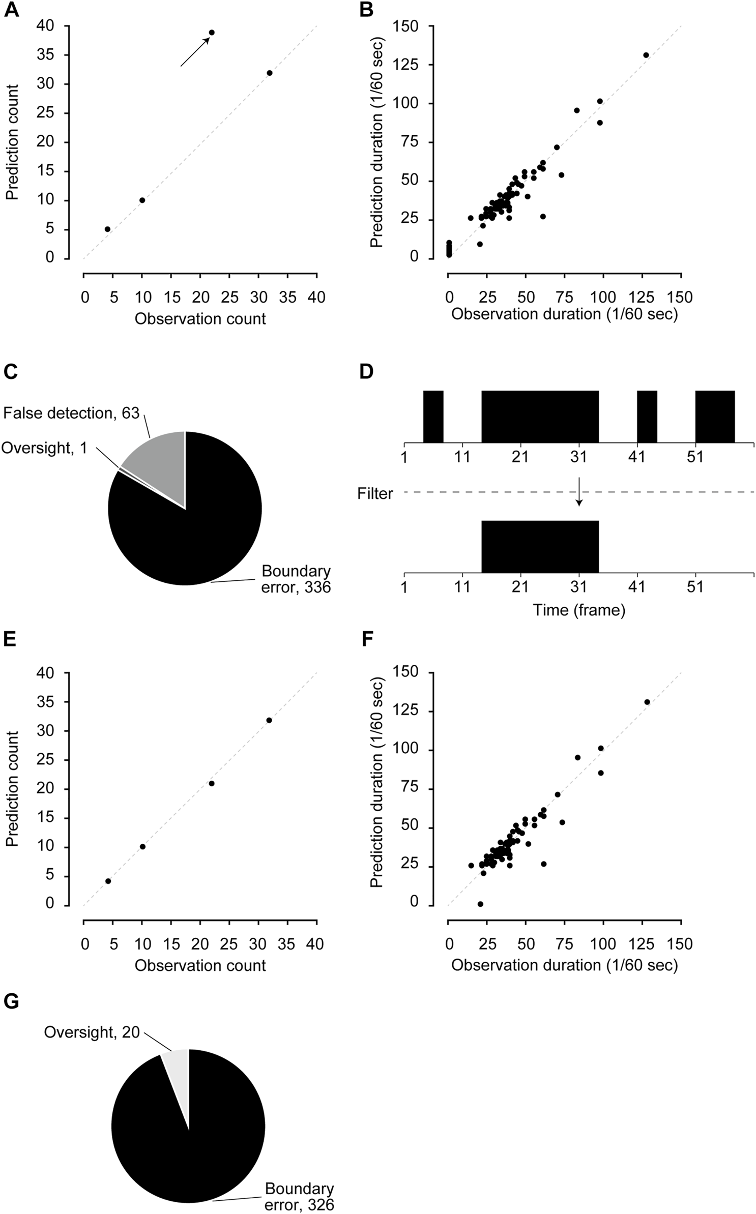 Performance validation and filter application. (A,B) The comparison of the number of scratching bouts (A) and duration (B) between human observation and pre-filtered predictions. (C) Details of mis-predicted frames in pre-filtered predictions. (D) Schematic figure of the posterior filter. (E,F) The comparison of the number of scratching bouts (E) and duration (F) between human observation and post-filtered predictions. (G) Details of mis-predicted frames in post-filtered predictions.