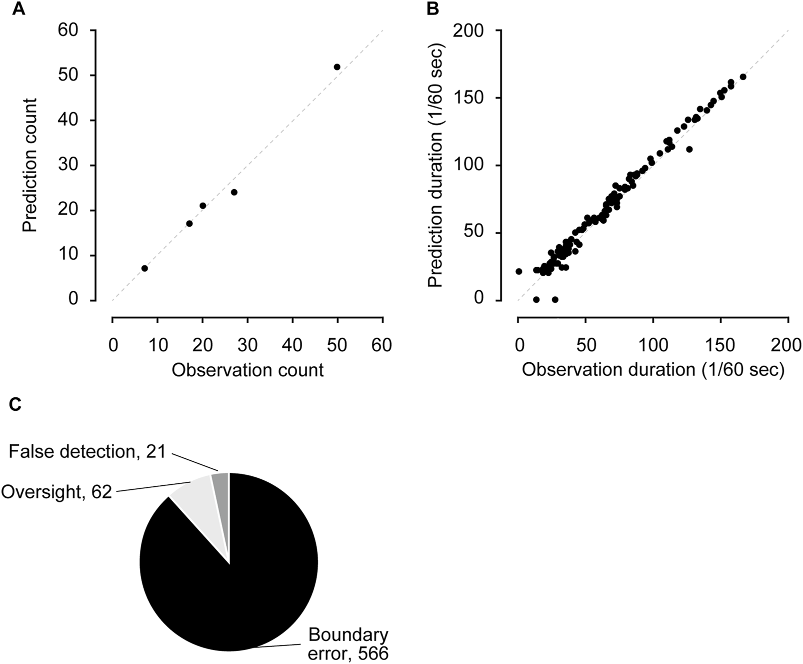 We evaluated the trained CRNN and filter performance using the test dataset. The test dataset consisted of five videos not used in the training or validation datasets. The sensitivity and specificity were 98.1% (7,814 of 7,968) and 99.9% (182,082 of 182,577), respectively. The positive predictive and negative predictive values were 94.0% (7,814 in 8,309) and 99.9% (182,082 in 182,236) (Table 1). The number of bouts and duration predicted by the CRNN and filter were highly correlated with those counted by humans (Figures 2A,B; bouts: r = 0.994, duration: r = 0.991). The most frequent errors were boundary errors (87.2%, 566 in 612); false detections and oversights accounted only for 3.2% (21 of 612) and 9.6% (62 in 612), respectively (Figure 2C). Because boundary errors can occur among human experimenters, these results demonstrate the high performance of the method.
