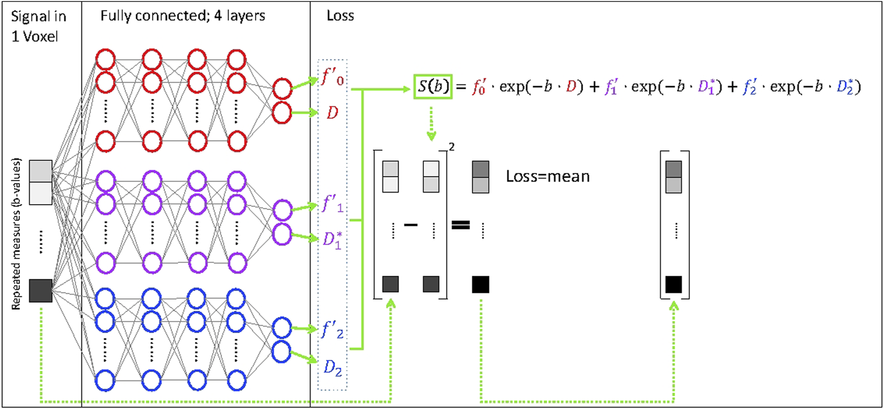 IVIM-NET bi and tri-exponential fits were also performed voxel-wise. The IVIM-NET bi-exponential fit was performed following previously published work, using a fully-connected network per IVIM parameter (, , and ) and a physics-informed loss function to minimize the root-mean-square error between input voxel signals and predicted signal decay. The hyperparameters were kept identical to the optimized setting previously published (Kaandorp et al., 2021), with a dropout of 0.1, batch normalization, two hidden layers, Adam optimizer and a learning rate of 3 × 10–5.