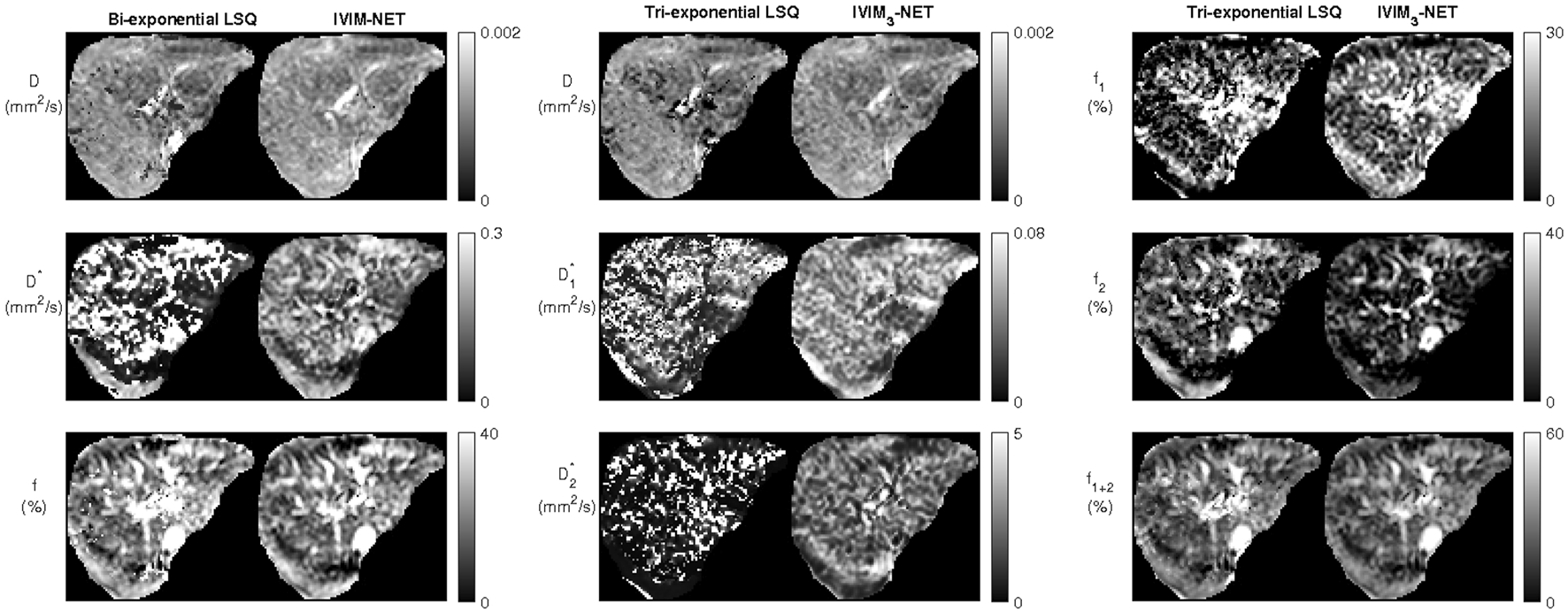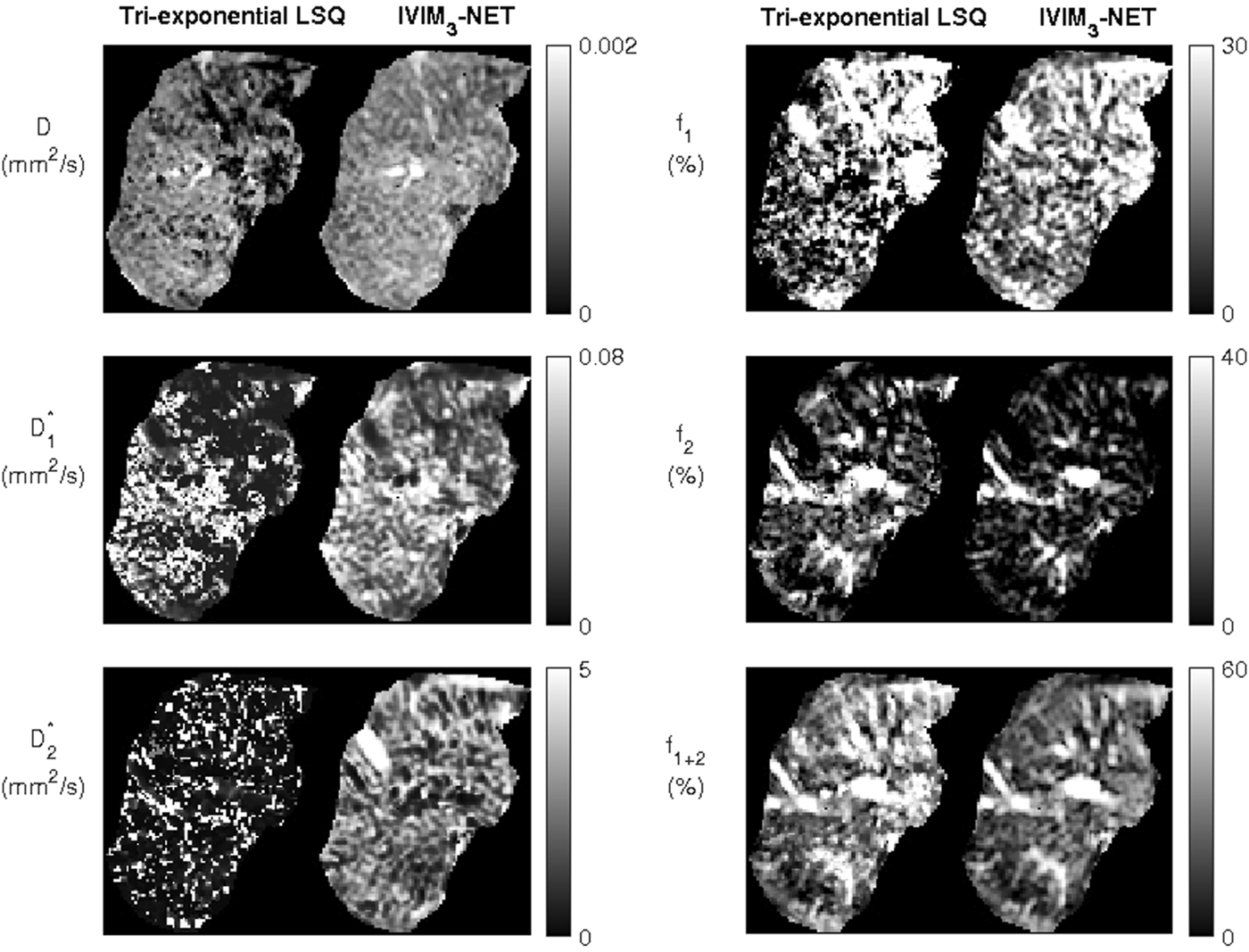 Although tri-exponential fitting more accurately describes the data, fitting of this complex model is challenging and current least-squares (LSQ) methods typically lead to noisy parameter maps, particularly in the case of pseudo-diffusion. As a result, tri-exponential fits are often done using averaged data from a region of interest (ROI), or even averaged data from multiple subjects, instead of voxel-wise fitting, reducing clinical diagnostic applicability.