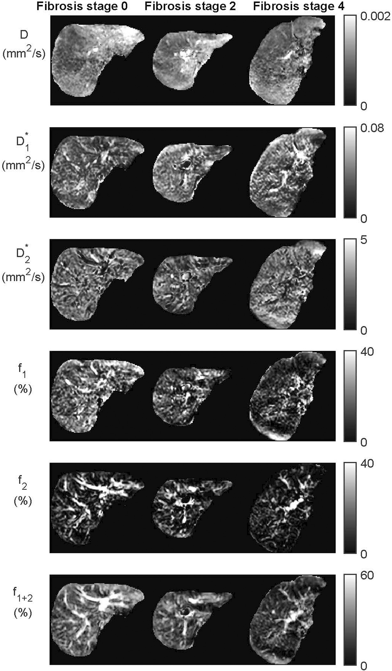 The clinical added value of the extra compartment is less clear in our cohort, as both the bi- and tri-exponential models showed comparable correlations with histopathology. However, NAFLD is known to cause vascular changes (Pasarín et al., 2017), thus particularly the evaluation of the additional perfusion parameter could be of interest, as this signal originates from larger vessels (Chevallier et al., 2021). We (visually) observed a large decrease in volumes with increasing levels of fibrosis (Figure 4), which could lead to radiological markers for disease severity.