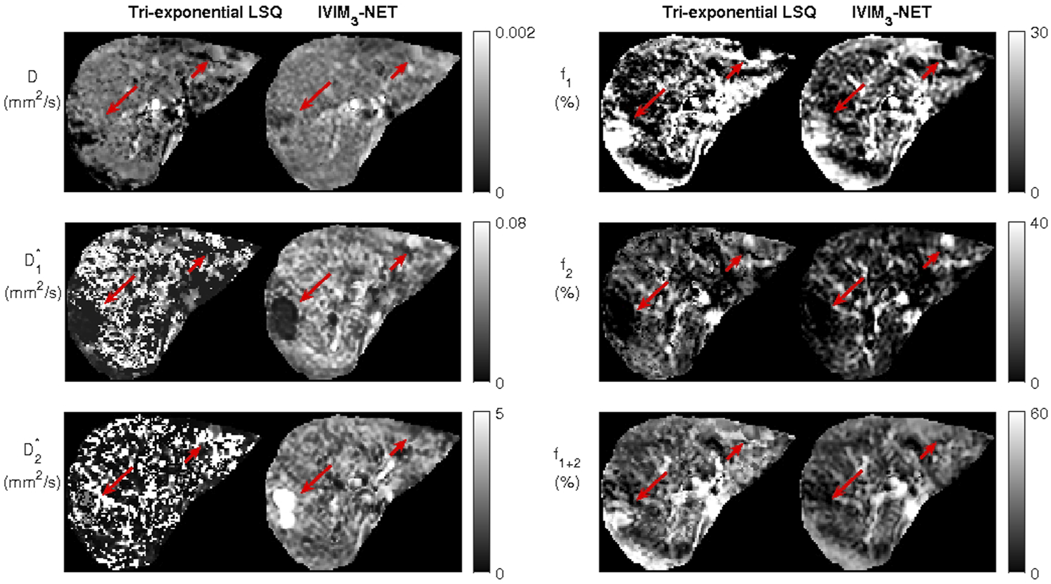 The use of a neural network for the generation of IVIM parameter maps resulted in higher quality images when compared to a least-squares fit, and in a fraction of the time. Simulated data shows a smaller error for the IVIM3-NET than LSQ fit, in particular at lower SNRs, confirming the results seen for the bi-exponential IVIM-NET (Kaandorp et al., 2021). A higher correlation was found between histopathology and neural network IVIM parameters compared to LSQ fits, highlighting a promising application for the use of the IVIM-NET and IVIM3-NET parameters as a non-invasive biomarker in NAFLD. Moreover, with the improved image quality, additional information may be available. Improved image quality allows for the analysis of images in a voxel-wise manner and may be able to provide more insights into disease pathophysiology. The visual decrease of areas with high signal intensity on and images with increasing fibrosis grades may, for example, be indicative of the before mentioned vascular changes in NAFLD. Thus voxel-wise assessment of images, such as volume of voxels with higher signal intensities, could be an interesting route to explore. Furthermore, while IVIM studies tend to focus on quantitative measures, improved parameter map quality may allow for qualitative assessment of images, for example aiding diagnosis of liver lesions such as presented in Figure 5.