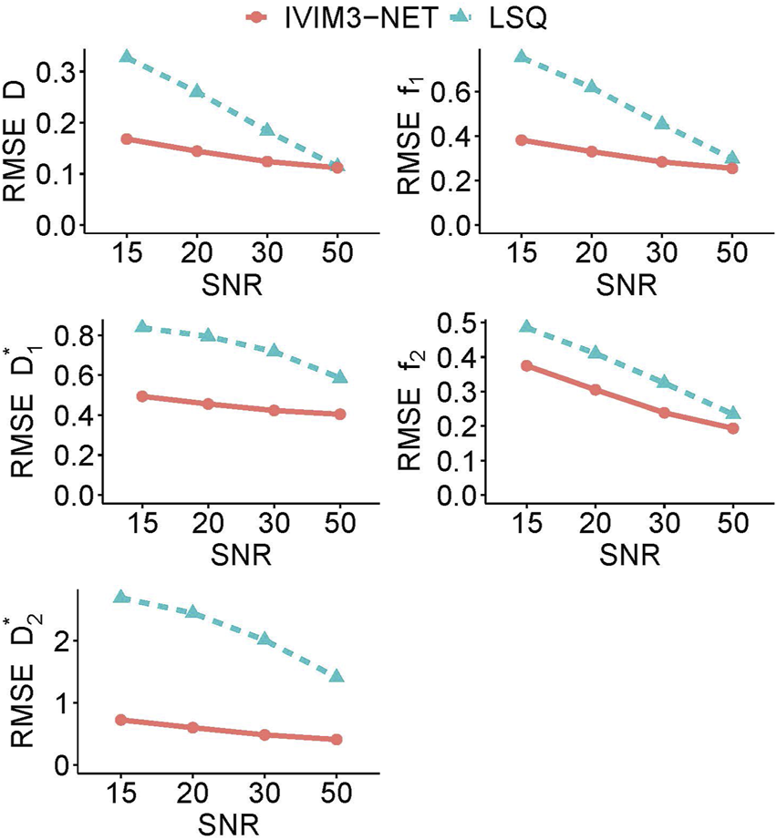 Average root mean square error (RMSE) for each tri-exponential IVIM parameter in simulated data for varying levels of SNR. The IVIM3-NET shows lower root mean square errors for all parameters and for all levels of SNR.