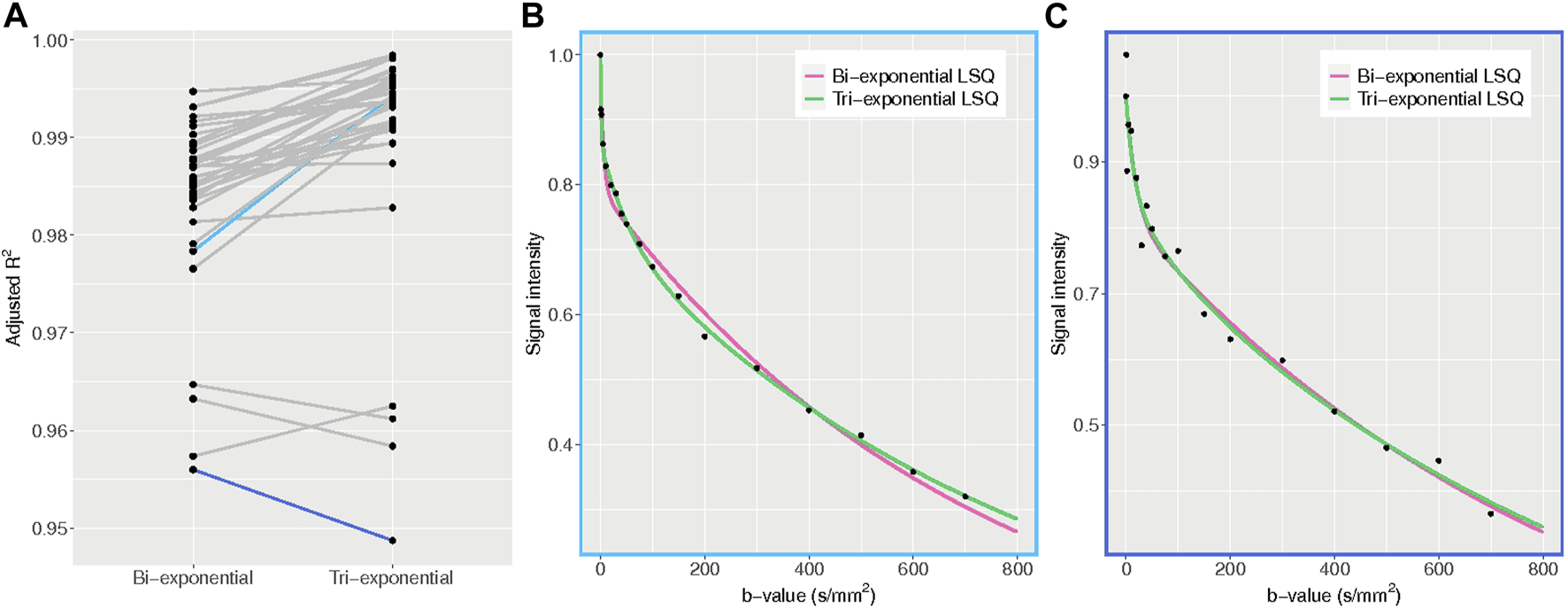 Adjusted R2 plots. (A) adjusted R2 values for the bi- and tri-exponential least-squares models for each individual. The blue lines represent the patients with the largest difference between bi- and tri-exponential fits, with light blue showing a higher R2 for the tri-exponential fit and dark blue a higher R2 for the bi-exponential fit. (B) example plot of the average signal intensity for each b-value and the corresponding bi- and tri-exponential fits from the patient with the largest difference between bi- and tri-exponential fits, favouring the tri-exponential fit. The tri-exponential fit more accurately fits the data points. (C) example plot of the average signal intensity for each b-value and the corresponding bi- and tri-exponential fits from the patient with the largest difference between bi- and tri-exponential fits, favouring the bi-exponential fit. Here the data points show more spread, indicating a noisier dataset.