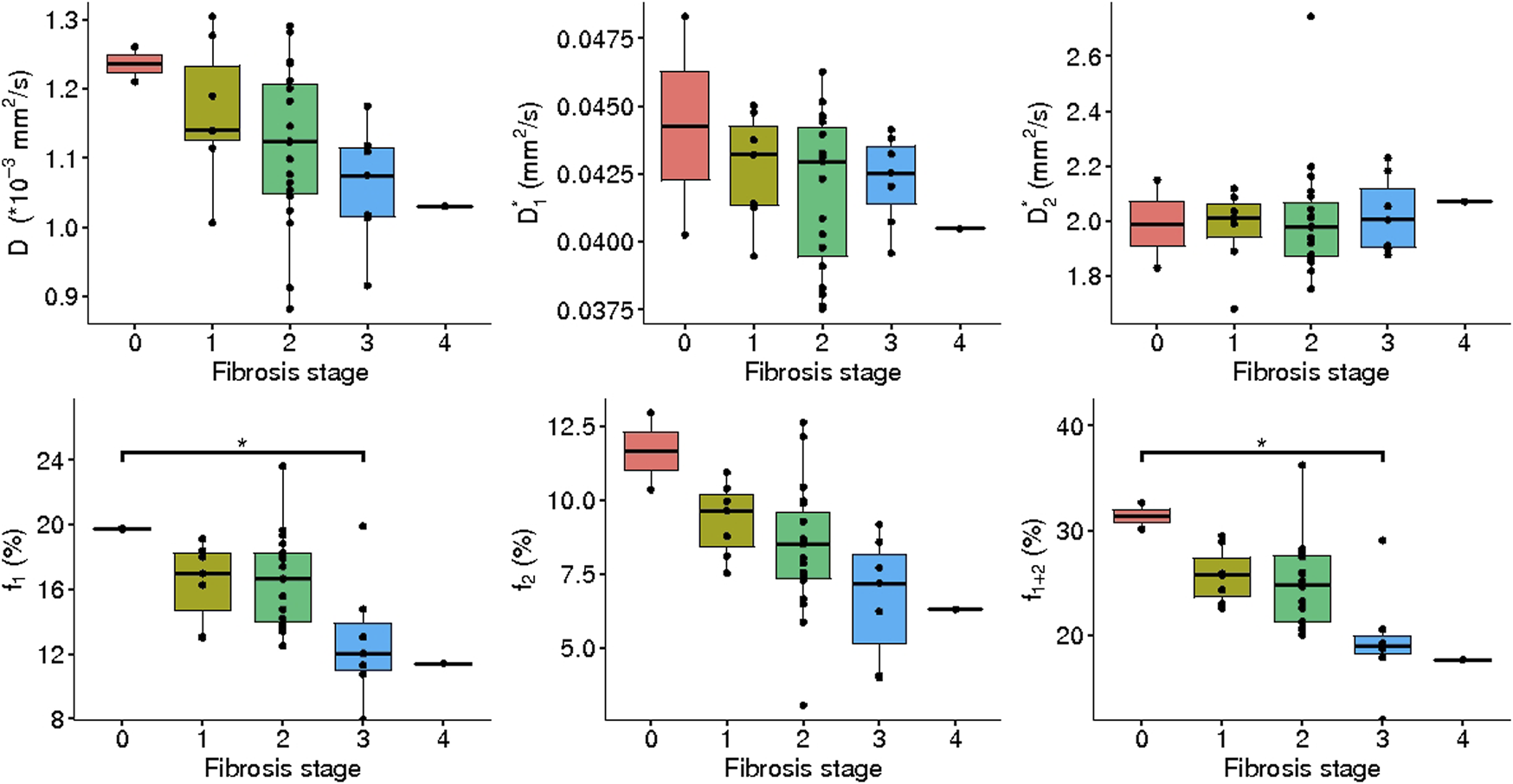 IVIM3-NET parameters versus fibrosis grade. All parameters except showed a significant correlation with fibrosis, while only showed a significant difference in medians between fibrosis stage 0 and 3; between stage 0 and 3, as well as stage 1 and 3.