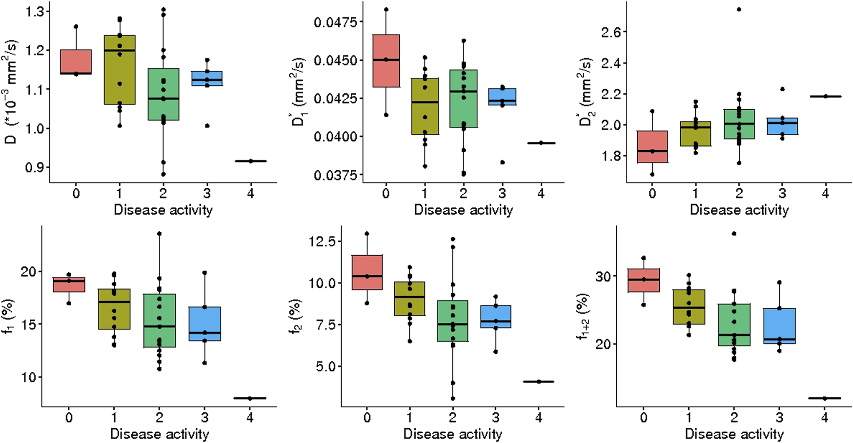 IVIM3-NET parameters versus disease activity. All parameters except showed a significant correlation with disease activity, yet no significant differences between medians of disease activity grades were found.