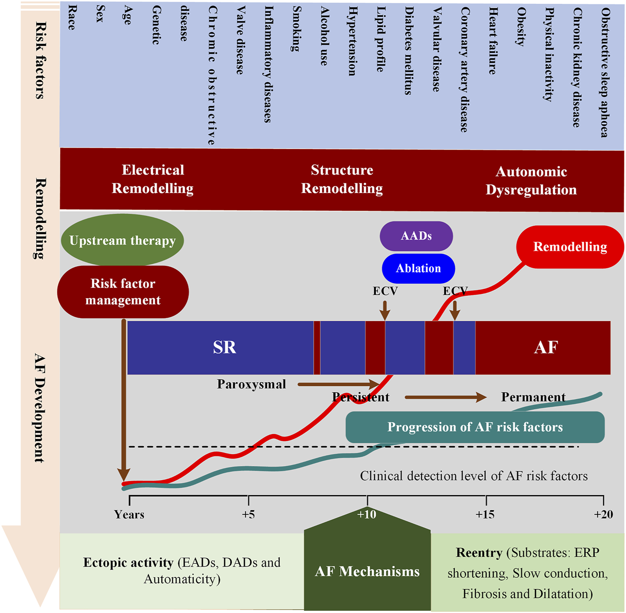 Schematic overview of mechanisms underlying AF development and progression. This figure depicts the interrelationships between risk factors, time-dependent atrial remodeling and progression from sinus rhythm (SR) through paroxysmal and persistent to permanent AF. ECV = electrical cardioversion; ERP = effective refractory period; AADs = antiarrhythmic drugs; EADs = Early afterdepolarization; DADs = Delayed afterdepolarization.