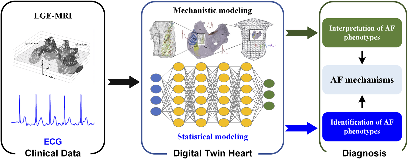 A digital twin heart that promises to transform from AF description to response prediction (i.e., from understanding AF mechanisms to screening anti-AF drugs and optimizing AF ablation strategies). In the digital twin heart, on the one hand, potential pathological mechanisms are explored through personalized multi-scale modeling and simulation; on the other hand, AF phenotypes are identified through a data-driven statistical model. Mechanistic and statistical models complement each other’s strengths to facilitate AF mechanism understanding and therapeutic evaluation. As experimental methods and imaging techniques continue to advance, more abundant and high-quality data will facilitate the development of digital twin hearts. Standardization of data acquisition and improved attention to re-usability will accelerate the development of digital twin technologies (Strocchi et al., 2020), while their integration into existing workflows will facilitate its clinical application. In the future, AF patients can be screened based on ECG biomarkers using statistical models (Xiong et al., 2018), while personalized biophysically detailed computational models of the atria based on the patient’s LGE-MRI can be used to interpret AF phenotypes (Figure 2) (Aslanidi et al., 2011).