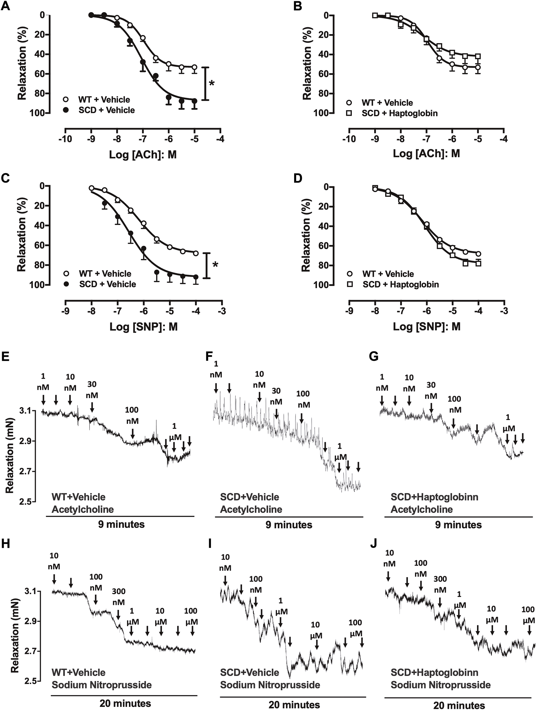 Concentration-response curves to acetylcholine [ACh; (A,B)] and sodium nitroprusside [SNP, (C,D)] in corpus cavernosum strips from WT and SCD mice treated or not with haptoglobin (Hap). Data were calculated relative to the maximal changes from the contraction produced by phenylephrine (10–5 M) in each tissue, which was taken as 100%. Data represent the mean ± SEM for 6 mice in each group. *p < 0.05 vs. WT-Vehicle; #p < 0.05 vs. SCD-Hap. Representative tracings of relaxant response to ACh (E–G) and SNP (H–J) in corpus cavernosum strips from WT and SCD mice treated or not with haptoglobin.