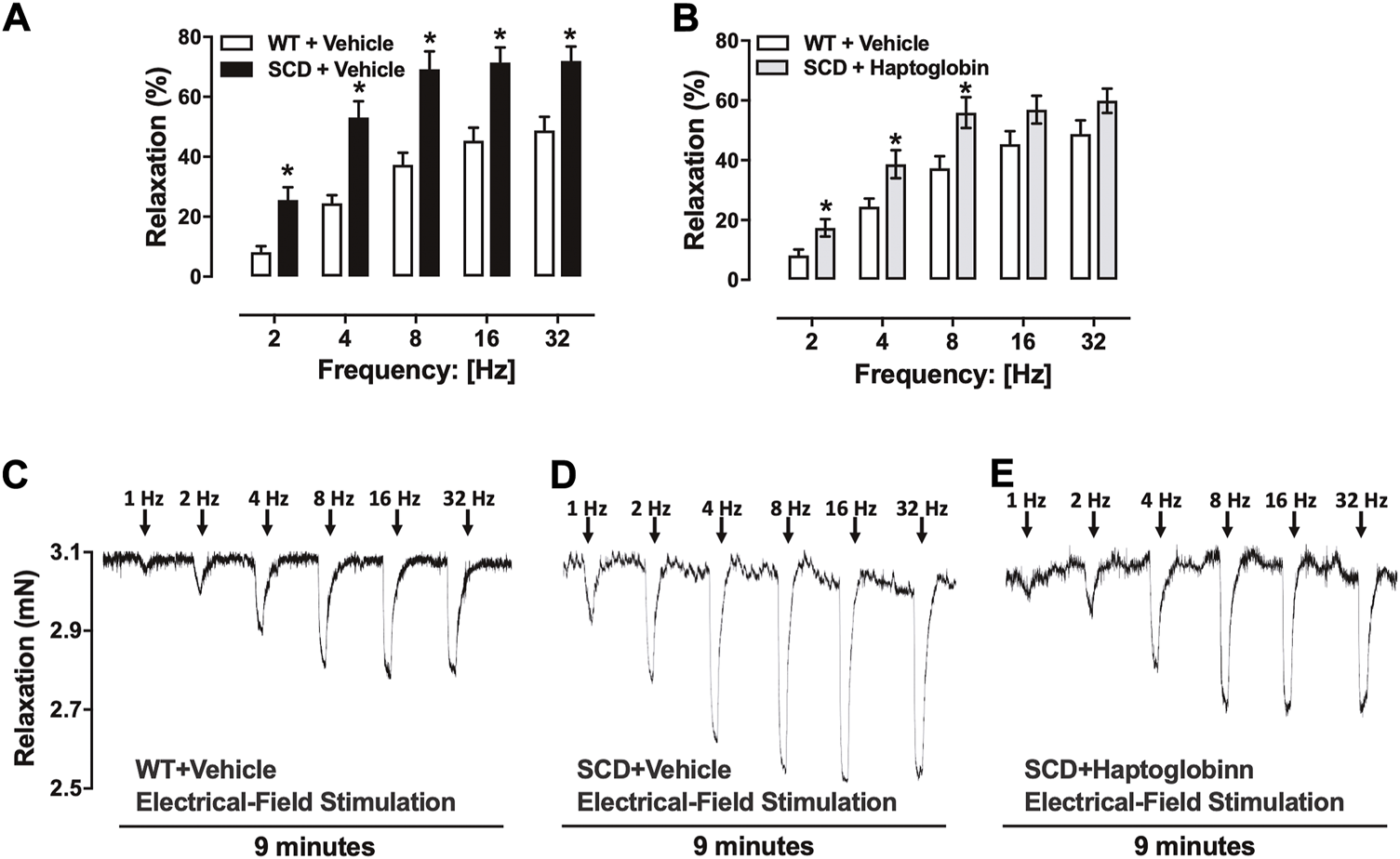 Electrical-field stimulation (EFS) of cavernosal tissues pretreated with guanethidine (3 × 10–5 M) and atropine (10–6 M) caused frequency-dependent mouse CC relaxations in all groups. CC relaxations to EFS were significantly higher (p < 0.05) in SCD compared to WT mice, as observed at 2–32 Hz (Figure 2A). Haptoglobin treatment reduced the EFS-induced increased relaxant responses in the CC from SCD (Figure 2B). Representative traces of responses to EFS are shown in Figures 2C–E.