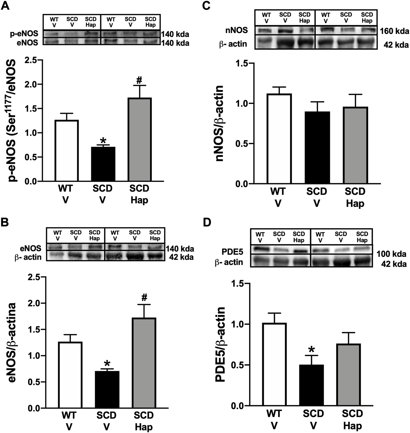 Representative images of western blotting (top panels) and protein values (bottom panels) for p-eNOS (Ser-1177; (A), eNOS (B), nNOS (C), and PDE5 (D) in homogenates of penises from WT and SCD mice treated or not with haptoglobin (Hap). Data represent the mean ± S.E.M. for 6 mice in each group. A single band for eNOS, nNOS and PDE5 was normalized to β-actin. A single band for p-eNOS (Ser-1177) was normalized to eNOS. *p < 0.05 vs. WT-Vehicle. #p < 0.05 vs. SCD-Hap.