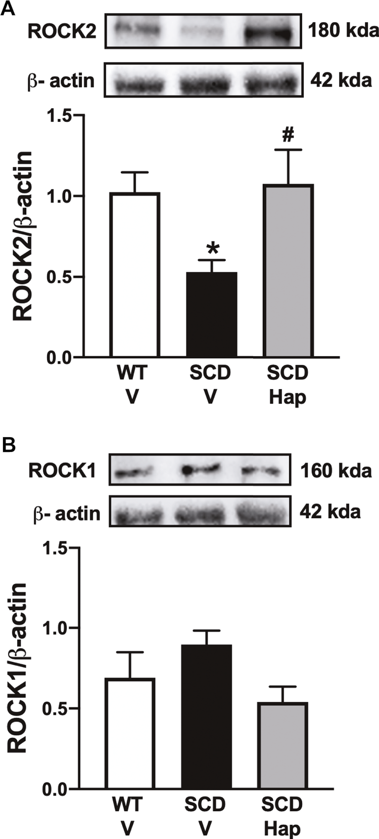 Representative images of western blotting (top panels) and protein values (bottom panels) for ROCK2 (A) and ROCK1 (B) in homogenates of penises from WT and SCD mice treated or not with haptoglobin (Hap). Data represent the mean ± S.E.M. for 6 mice in each group. A single band for ROCK1 and ROCK2 was normalized to β-actin. *p < 0.05 vs. WT-Vehicle; #p < 0.05 vs. SCD-Hap.