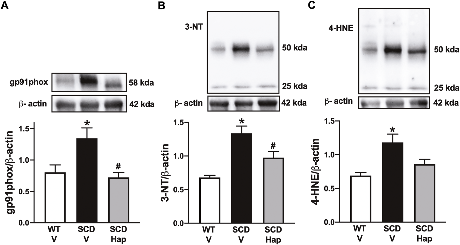 Representative images of western blotting (top panels) and protein values (bottom panels) for gp91phox(A), 3-NT (B), and 4-HNE (C) in homogenates of penises from WT and SCD mice treated or not with haptoglobin. Data represent the mean ± S.E.M. for 6 mice in each group. A single band for gp91phox, 3-NT and 4-HNE was normalized to β-actin. *p < 0.05 vs. WT-Vehicle; #p < 0.05 vs. SCD-Hap.