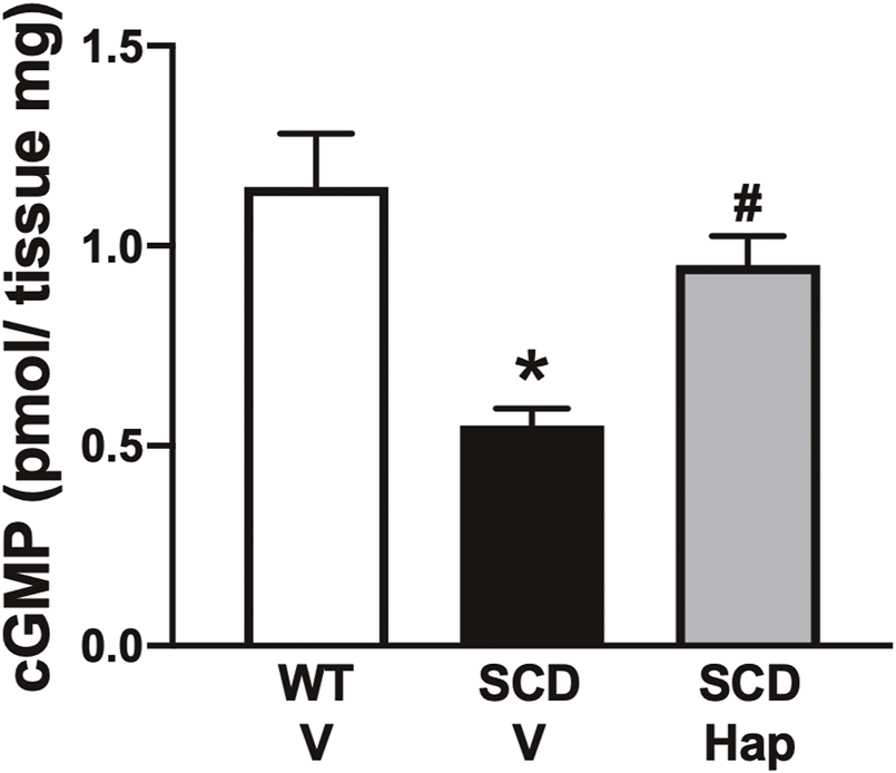 Basal GMP contents of penis from WT and SCD mice treated or not with haptoglobin. Data represent the mean ± S.E.M. for 6 mice in each group. *p < 0.05 vs. WT-Vehicle; #p < 0.05 vs. SCD-Hap.