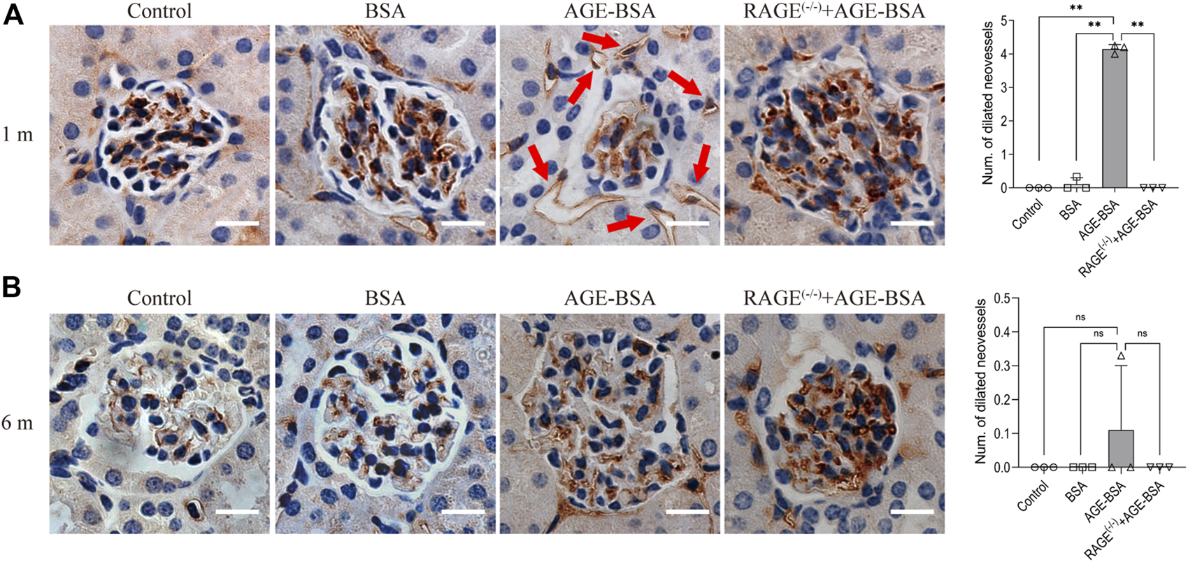 AGE-BSA induces RAGE-mediated renal angiogenesis in the early stage of stimulation. Representative images of CD34 staining of glomeruli after AGE-BSA treatment for 1 m (A) and 6 m (B) are shown, and the number of dilated vessels around glomeruli was counted and analyzed. Arrow: dilated neovessels around the renal capsule. Scale bar = 20 μm. n = 3, **p < 0.01, ns: no significance.