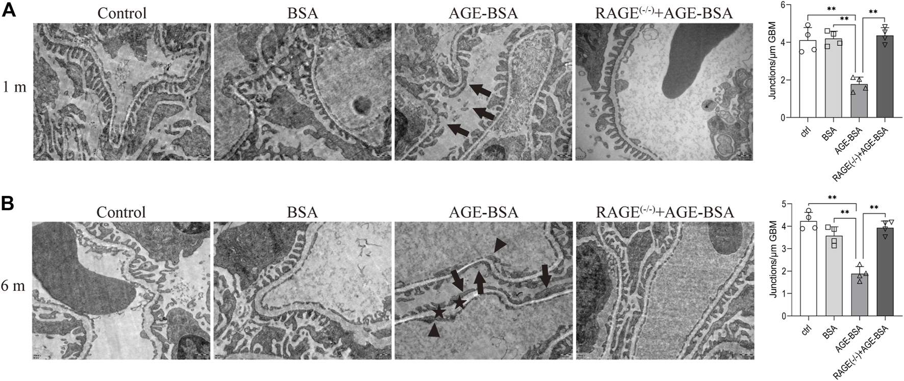 AGE-BSA induces RAGE-mediated ultrastructure alteration of podocytes and basement membrane in renal glomeruli. TEM of renal tissue was performed at 1 m (A) and 6 m (B) after treatment. The podocyte intercellular junction frequency was quantitatively analyzed (right panels). Arrow: podocyte pseudopodia. Arrowhead: glomerular endothelial cells. Asterisk: basement membrane. Scale bar = 500 nm n = 4. *p < 0.05 and **p < 0.01.