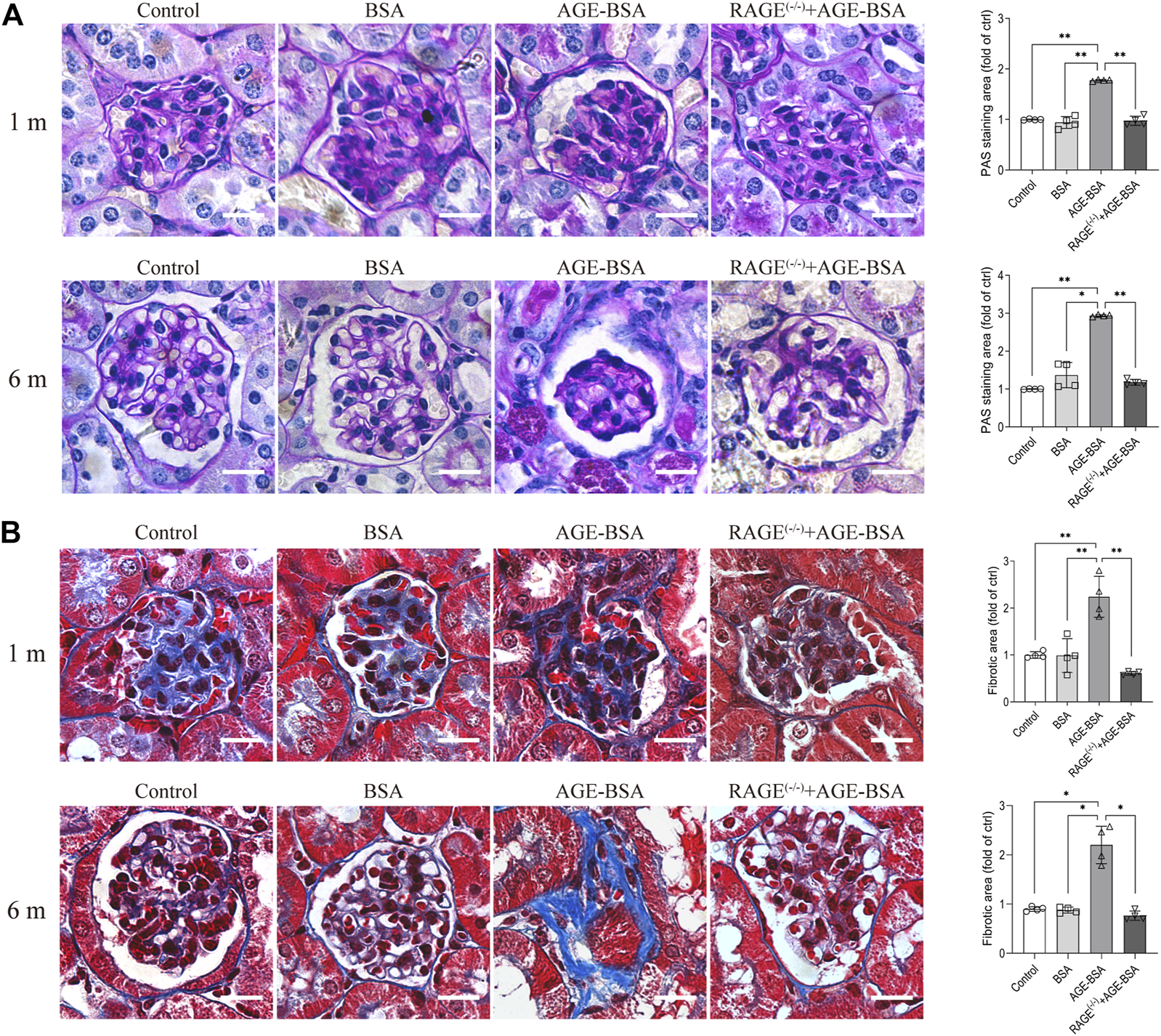 AGE-BSA induces RAGE-mediated renal fibrosis. (A) PAS staining and (B) Masson’s staining were conducted in renal tissues from WT and RAGE (−/−) mice after 1 and 6 m AGE treatment. Scale bar = 20 μm. n = 4, *p < 0.05, and **p < 0.01.
