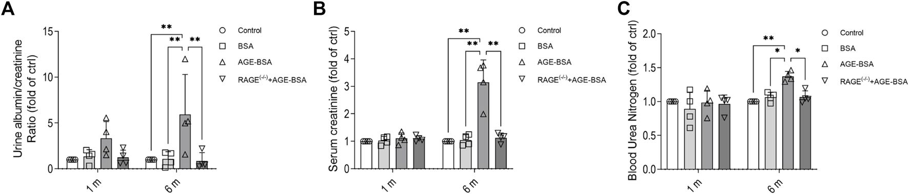 AGE-BSA induces RAGE-mediated renal dysfunction. The ratio of urine albumin to creatinine (A) was regarded as the level of albuminuria. Serum creatinine (B) and blood urea nitrogen (C) were also measured. n = 4, *p < 0.05, and **p < 0.01.