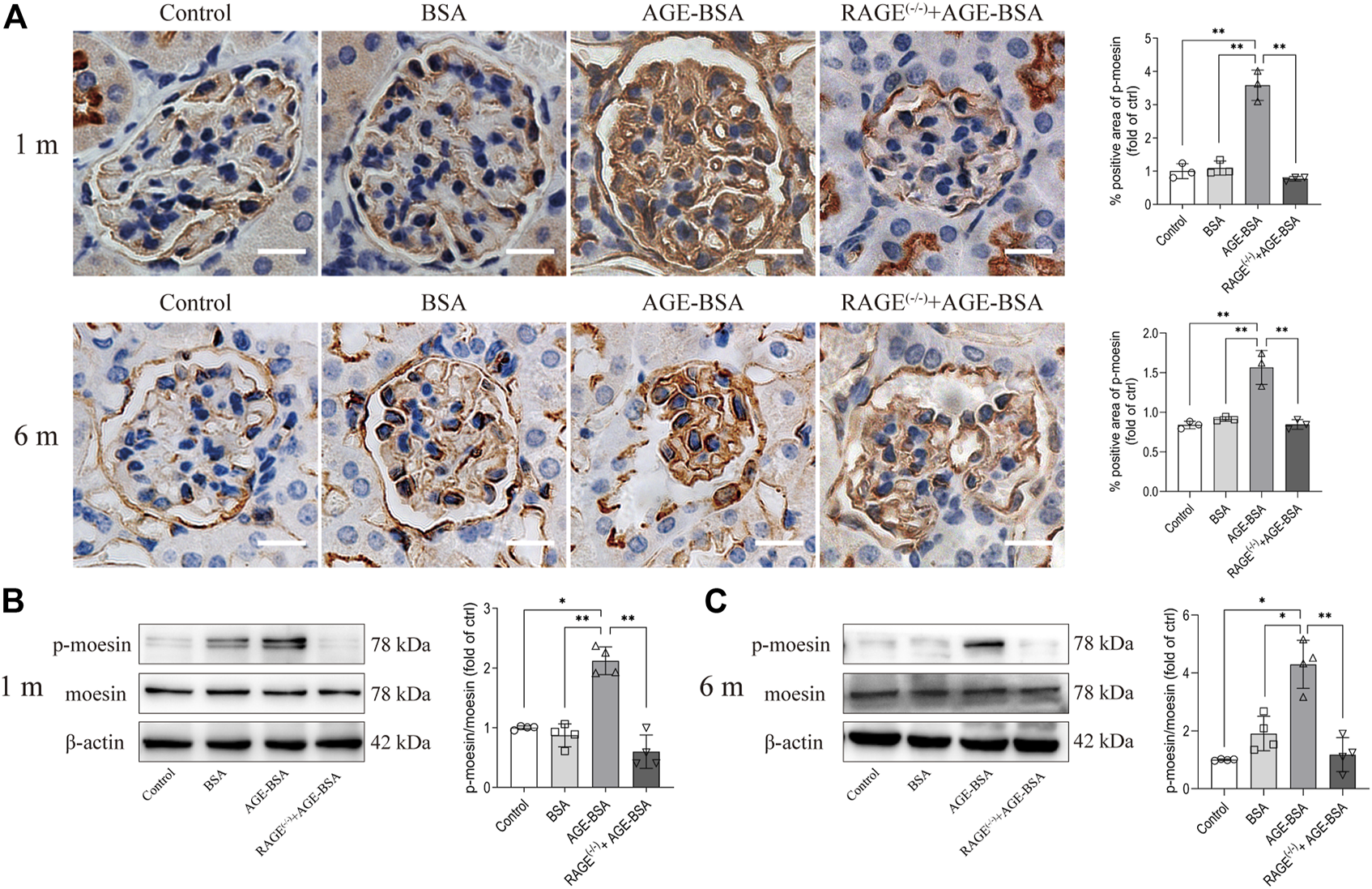 AGE-BSA enhanced the level of moesin phosphorylation in mouse kidneys. (A) Immunohistochemical staining of phospho-moesin at 1 and 6 m after treatment. Scale bar = 20 μm. n = 3 and **p < 0.01. (B,C) Phospho-moesin and total moesin expression in kidneys from AGE-BSA-treated mice for 1 m (B) and 6 m (C) were detected by immunoblotting. n = 4, *p < 0.05, and **p < 0.01.