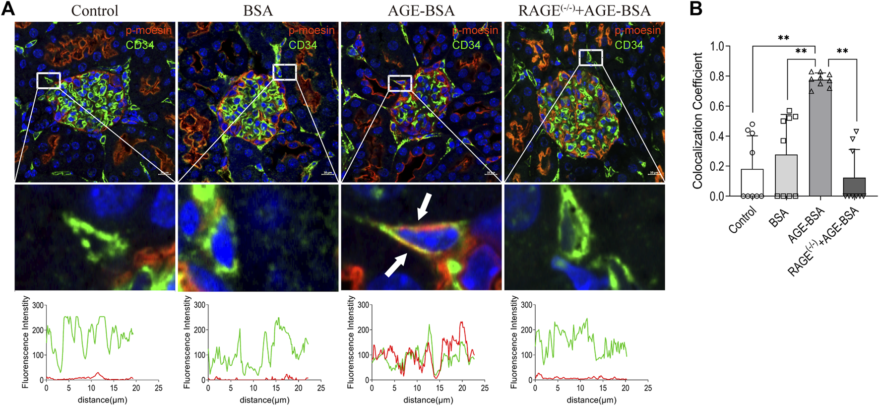 Colocalization of phospho-moesin with CD34 in renal glomeruli under AGE treatment. (A) Phospho-moesin (red) and CD34 (green) were presented in renal glomeruli by immunofluorescence assay with TSA (tyramide signal amplification) technology. DAPI (blue) was used to stain nuclei (upper panel). Scale bar = 10 μm. Periglomerular vessel (CD34+) was selected for detailed observation (middle panel) of colocalization with phospho-moesin (white arrows). The green and red fluorescence density and localized distance were measured (lower panel). (B) Quantification of the fraction of phospho-moesin colocalizing with CD34 in different groups, expressed as the Mander’s overlap colocalization coefficient. n = 9 (three different fields analyzed from one sample from three different animals), **p < 0.01.