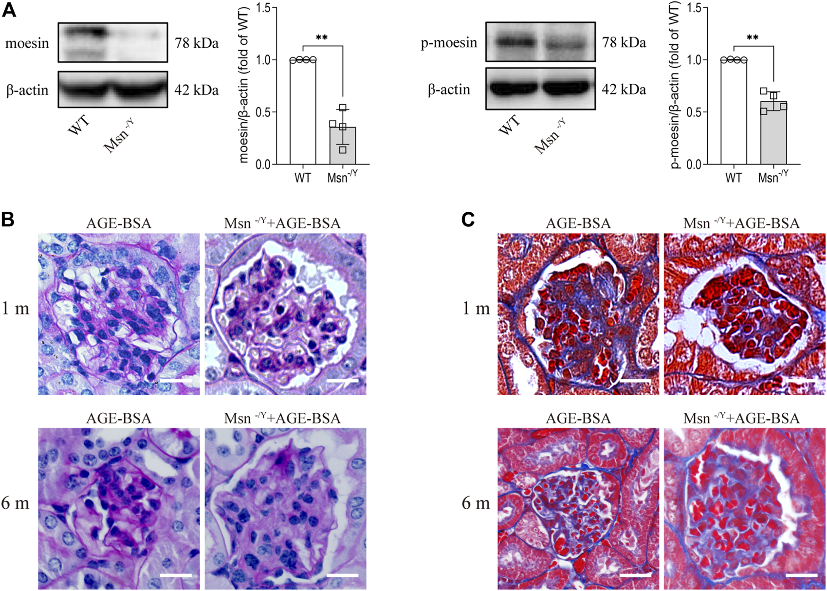 Moesin deficiency attenuated AGE-BSA-induced renal fibrosis. (A) Efficiency of moesin knockout in mice was confirmed by Western blot. n = 4. **p < 0.01. (B) PAS and (C) Masson’s staining were conducted in renal tissue from both 1 and 6 m AGE-BSA-treated Msn−/Y mice and compared with AGE-treated WT mice.