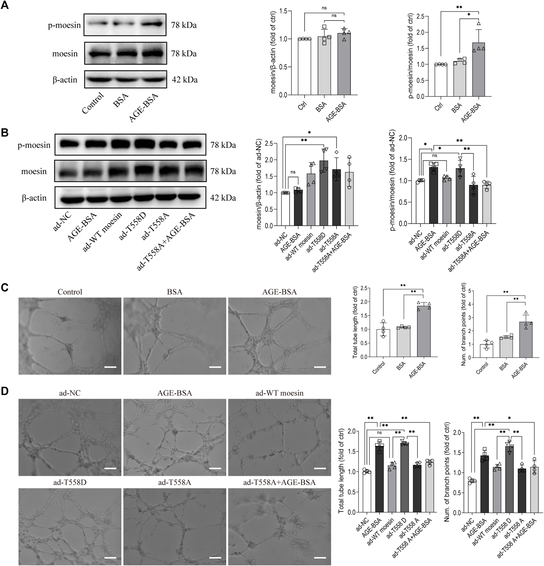Moesin T558 phosphorylation is important in the AGE-mediated tube formation of GECs. The state of moesin phosphorylation in GECs after AGE-BSA (A) and moesin mutant adenovirus (B) treatments were detected. Tube formation of GECs treated with AGE-BSA (C) or wild-type moesin (ad-WT moesin), moesin T558D (ad-T558D), and moesin T558A (ad-T558A) adenovirus (D) is shown. Scale bar = 20 μm. n = 4, *p < 0.05, and **p < 0.01.