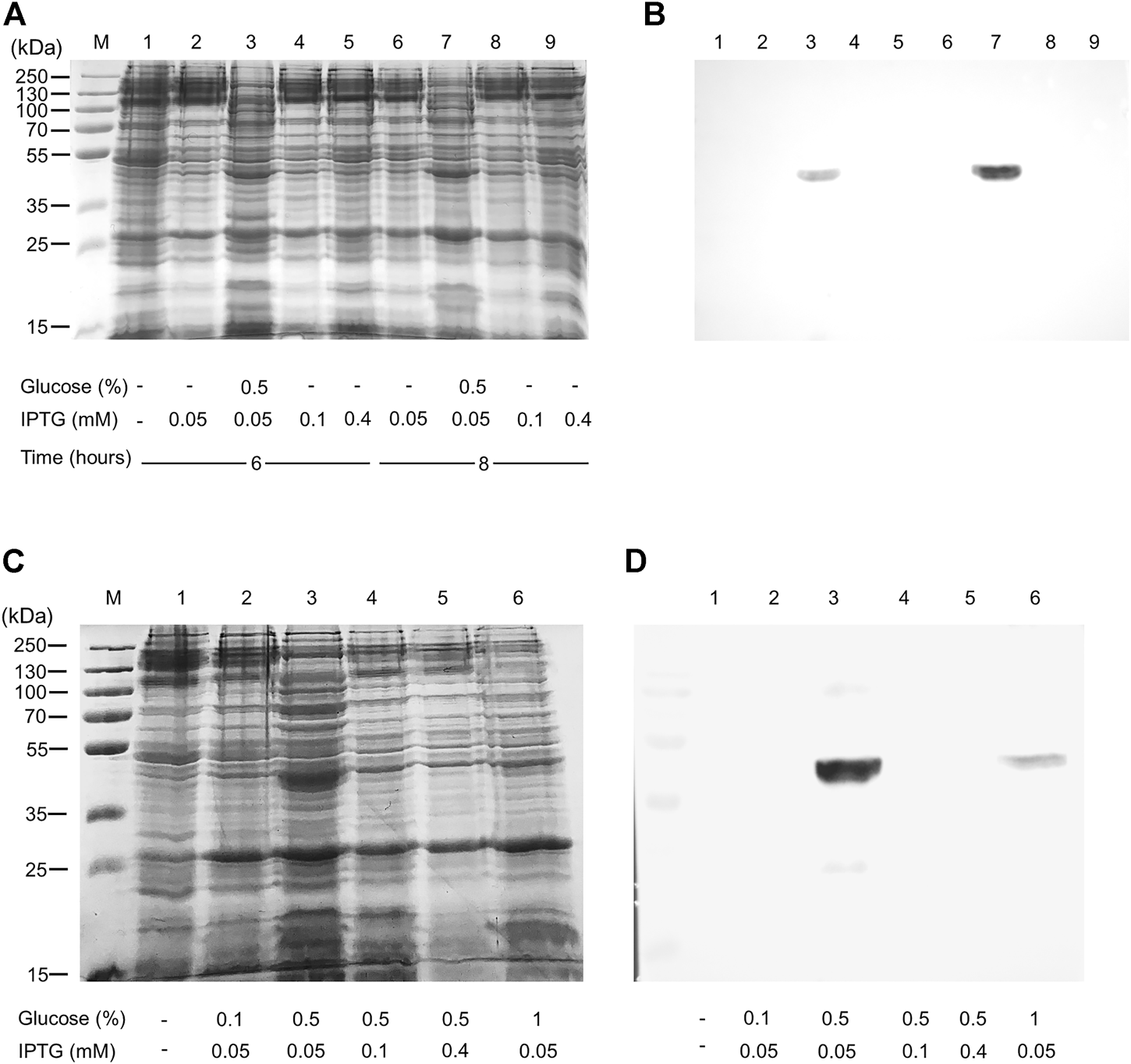 Human xCT expression in E. coli BL21. E. coli BL21 codon plus was transformed with hxCT-pH6EX3 construct and cultured in the absence or presence of 0.5% glucose. The effect of different IPTG concentrations at different times of induction was also tested. (A) SDS-PAGE of insoluble fractions from: 1, uninduced cell lysate; 2–9 induced cell lysates in different conditions: IPTG, glucose concentration and times of growth are indicated in the figure; M, page ruler prestained plus marker; (B) Western blotting using an anti-His antibody of the samples loaded as in (A). (C) SDS-PAGE of insoluble fractions after 8 h of growth from: 1, uninduced cell lysate; 2–6 induced cell lysates in different conditions: IPTG and glucose concentrations are indicated in the figure; M: page ruler prestained plus marker. (D) Western blotting using anti His antibody of the samples loaded as in (C).