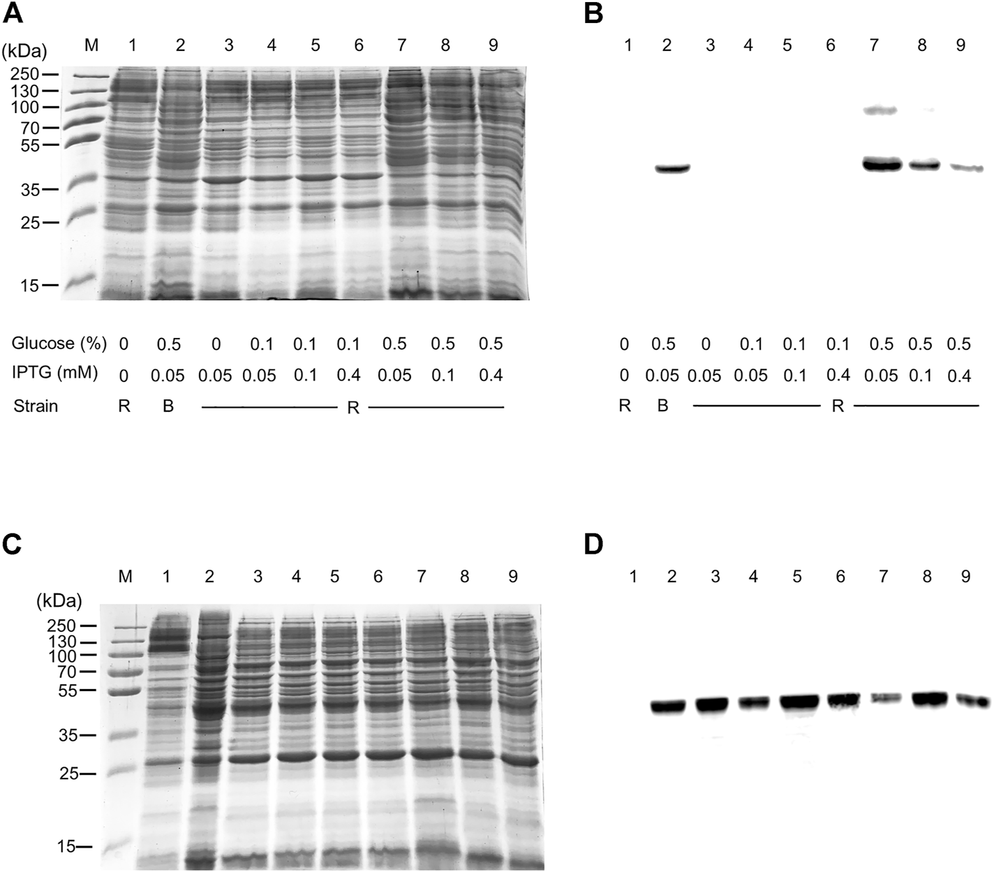 hxCT expression: the effect of strain, medium, and oxygen. E. coli BL21 codon plus or Rosetta (DE3) strain was transformed with hxCT-pH6EX3 construct and cultured in the absence or presence of different glucose and IPTG concentrations. (A) SDS-PAGE of insoluble fractions after 8 h of growth from: 1, uninduced cell lysate; 2–9 induced cell lysates in different conditions: IPTG and glucose concentration are indicated in the figure; M, page ruler prestained plus marker; R, Rosetta (DE3); B, BL21 codon plus. (B) Western blotting using anti His antibody of the samples loaded as in (A). (C) SDS-PAGE of insoluble fractions of Rosetta cells after 8 h of growth from: 1, uninduced lysate; 2–9, in presence of 0.5% glucose and 0.05 mM IPTG. In particular, lanes 2 and 3, from 25 ml of LB and Terrific broth, respectively, cultured in a 250 ml Erlenmeyer open flask; lane 4: sample treated as in lane 3 but in presence of plug; lanes 5–7, from 100, 200, and 300 ml of Terrific broth, respectively, cultured in a 1 L Erlenmeyer open flask; lanes 8 and 9, from 200 ml of Terrific broth cultured in a 2 L open and closed Erlenmeyer flask, respectively. (D) Western blotting using anti His antibody of the samples loaded as in (C).
