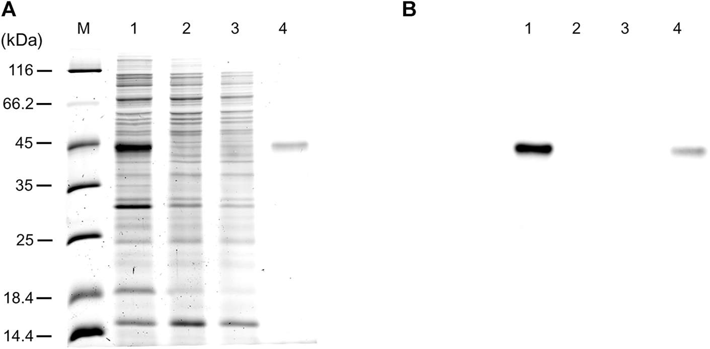 hxCT purification. (A) Proteins were separated by SDS–PAGE and visualized by a stain-free procedure as described in materials and methods: lane M, page ruler unstained marker; lane 1: sample as in Figure 2 lane 8 solubilized before IMAC loading; lane 2: flowthrough fraction containing the unbound proteins; lane 3: fraction of the protein eluted with washing buffer added with 10 mM imidazole; lane 4: fraction of the protein eluted with washing buffer added with 500 mM imidazole. (B) Western blotting using anti His antibody of the samples loaded as in (A).