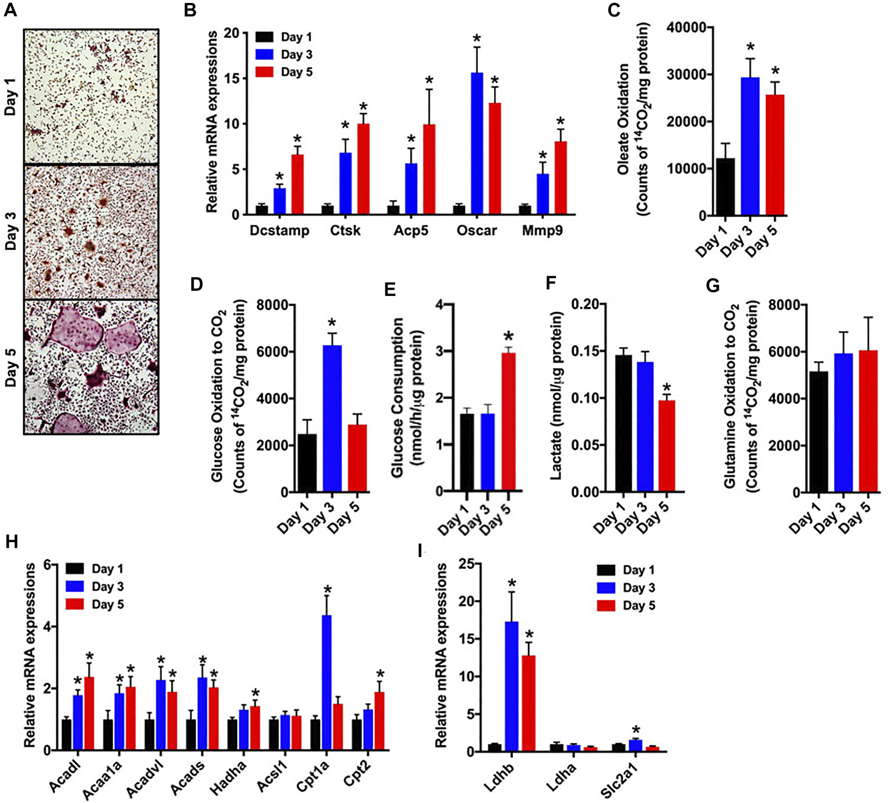 FIGURE 1. Fatty acid and glucose oxidation increase during osteoclast differentiation. Bone marrow cells were treated with M-CSF and RANKL to induce osteoclast differentiation in vitro. (A,B) TRAP staining (×10 original magnification) (A) and qPCR analysis of osteoclastic gene expression (B) were assessed on days 1, 3 and 5 of culture. Oxidation of [14C]-oleate to 14CO2 (C), oxidation of [14C]-glucose to 14CO2 (D), glucose consumption (E), cellular lactate levels (F), and [14C]-glutamine oxidation to 14CO2 (G) were assessed in differentiating osteoclasts. The mRNA levels of genes associated with fatty acid (H) and glucose metabolism (I) were assessed by qPCR. All data are represented by mean ± SEM. *p < 0.05 vs. Day 1. n = 5–7 for each time-point.
