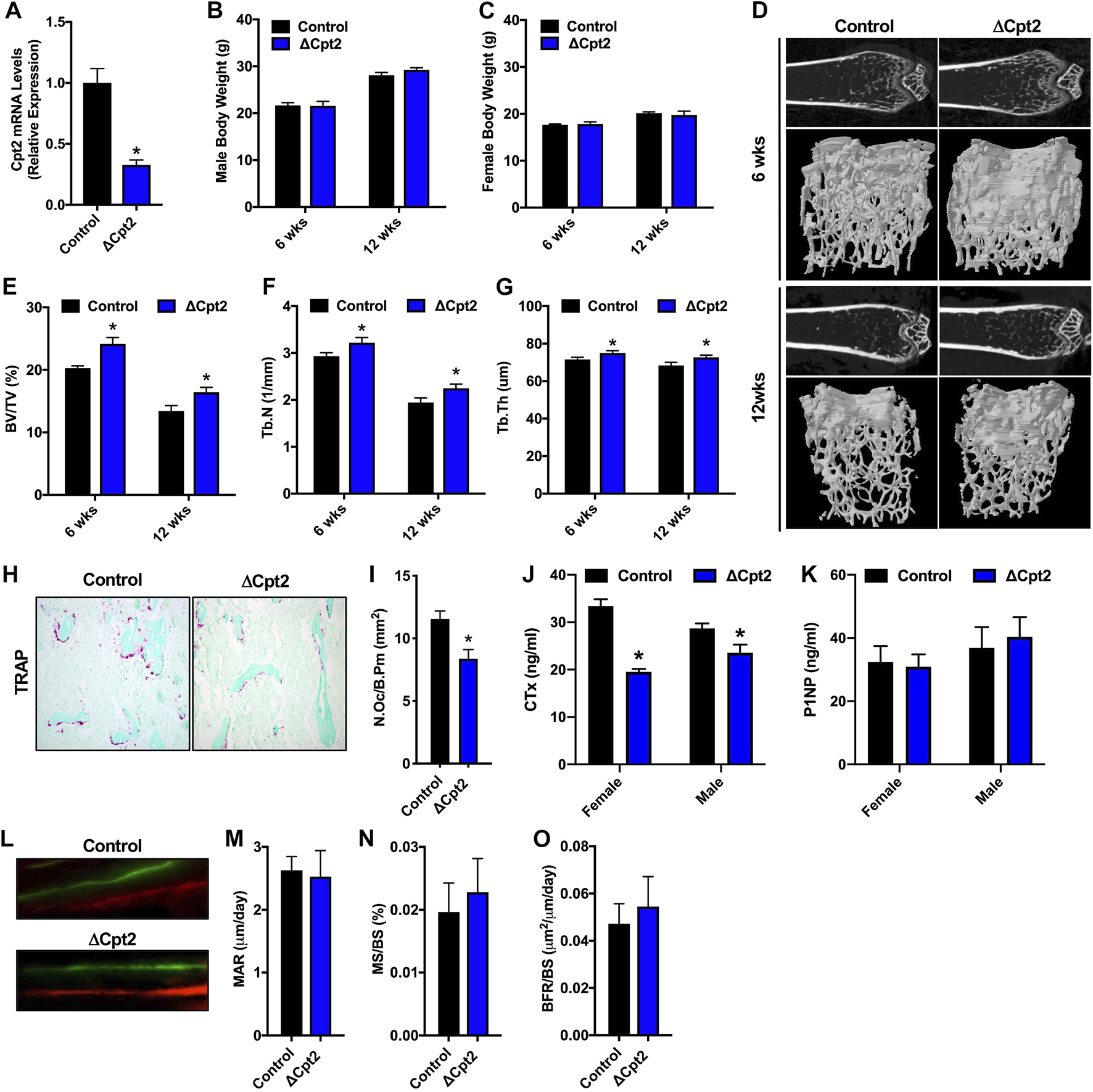 FIGURE 2. Female ΔCpt2 mice have increased bone mass with reduced numbers of osteoclasts. (A) qPCR analysis of Cpt2 mRNA levels in osteoclasts differentiated from bone marrow cells isolated from 6 week old control and ΔCpt2 mice. (B,C) Body weight was assessed in male (B) and female (C) control and ΔCpt2 mice at 6 and 12 weeks of age (n = 8–10 mice). (D) Representative computer renderings of bone structure in the distal femur of 6 and 12 weeks old female control and ΔCpt2 mice. (E–G) Quantification of bone volume per tissue volume (BV/TV, (E), trabecular number (Tb.N, (F) and trabecular thickness (Tb.Th, (G) in the distal femur by microCT (n = 8–11 mice). (H) Representative staining for TRAP activity in 5 μm sections from the distal femur of 6 weeks old female mice (×10 original magnification). (I) Quantification of osteoclast numbers per bone perimeter (N.Oc/B.Pm) in the distal femur of 6 weeks old female mice (n = 6–7). (J–K) Serum analysis of CTx (J) and P1NP (K) in 6 weeks old male and female control and ΔCpt2 mice (n = 8–9 mice). (L) Representative dynamic histomorphometric images of female control and ΔCpt2 femurs labeled with calcein and alizarin red. Mineral apposition rate [MAR, (M)], mineralizing surface per bone surface [MS/BS, (N) and bone formation rate [BFR/BS, (O)] was assessed in the femurs of 6 weeks old female mice (n = 6–7). All data are represented by mean ± SEM. *p < 0.05.
