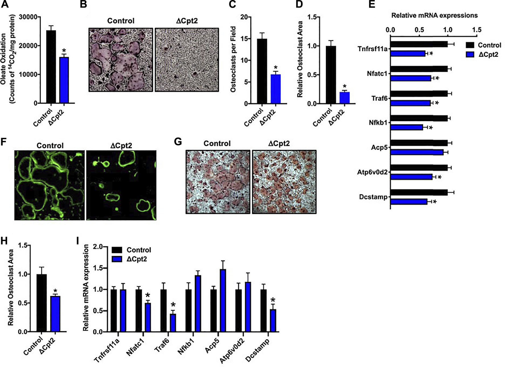 FIGURE 3. Mitochondrial fatty acid β-oxidation is required for osteoclast differentiation in vitro. Bone marrow cells isolated from female 6 weeks old control and ΔCpt2 mice were differentiated in the presence of M-CSF and RANKL for 5 days. (A) β-oxidation was indexed by the oxidation of [14C]-oleate to 14CO2. (B) Representative micrographs of TRAP-positive osteoclasts differentiated from control and ΔCpt2 bone marrow cells (×10 original magnification). Multinucleated (>3nuclei/cell) osteoclast per field (C), relative osteoclast area (D) and relative mRNA levels of osteoclast differentiation associated genes (E) were assessed after 5 days of differentiation. As an indicator of osteoclast function, bone marrow cells were differentiated for ×5 days on Osteo-Assay plates to examine resorption pit formation [(F), ×10 original magnification] or differentiated on tissue culture plastic and stained with FITC-phalloidin to examine actin ring formation [(G), ×10 original magnification]. TRAP staining [(H), ×4 original magnification] was performed and relative osteoclast area (I) was measured in osteoclast differentiated from bone marrow cells isolated from 6 weeks old male control and ΔCpt2 mice. All data are represented by mean ± SEM. *, p < 0.05. n = 4–10 for each condition.