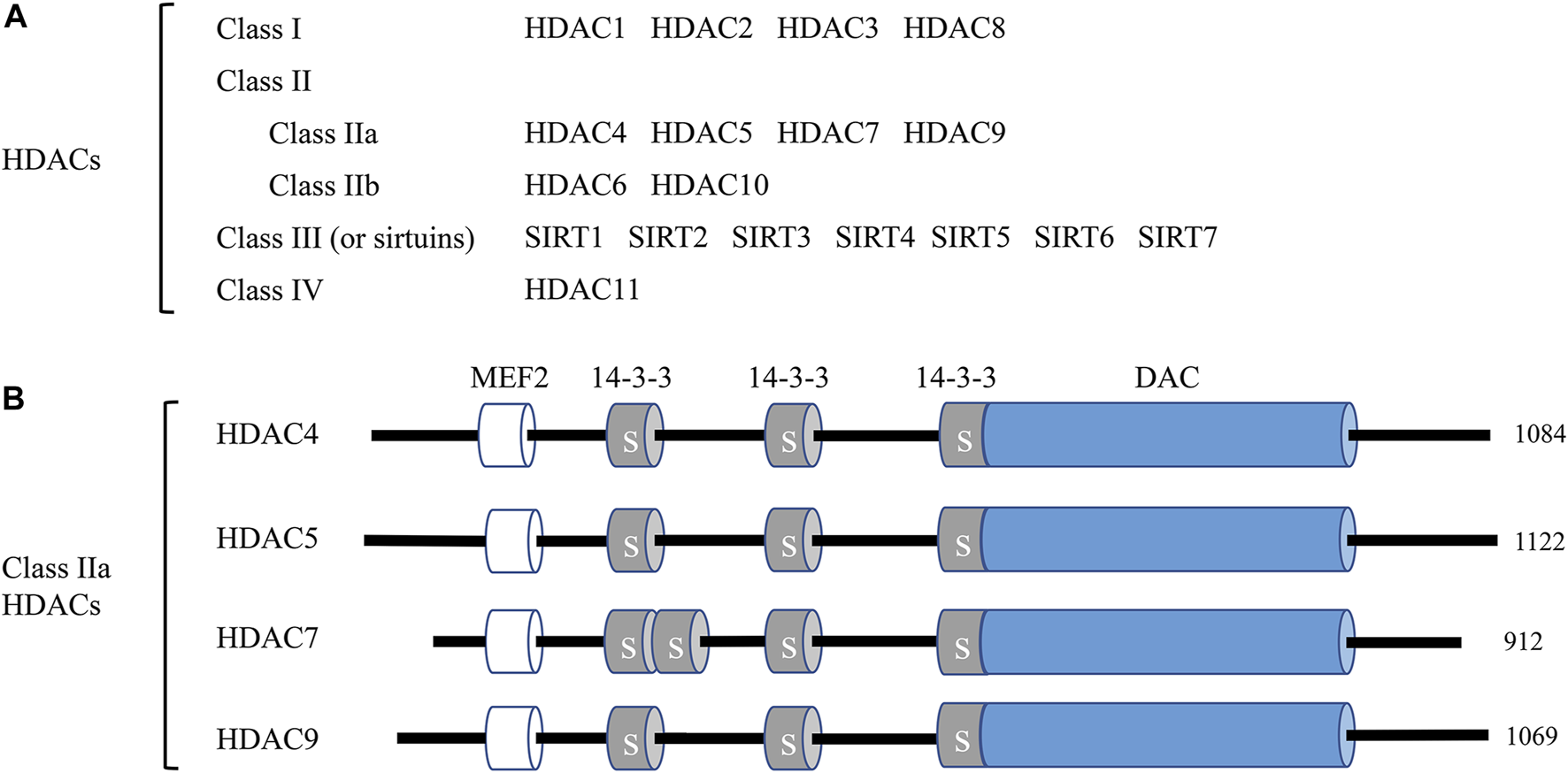 Classification of histone deacetylases (HDACs) and the domain organization of class IIa HDACs. (A) A total of 18 mammalian HDACs are categorized into four classes. Including HDAC11, all HDACs are involved in endothelial cell function at different levels and by different mechanisms. (B) The domain organization of class IIa HDACs. Class IIa HDAC members HDAC4, HDAC5, HDAC7, and HDAC9 and their total amino acid lengths are shown on the right. MEF2, myocyte enhancer factor 2 (MEF2) binding domain; 14-3-3, 14-3-3 binding motifs, label S is for Ser; DAC, deacetylation domain.