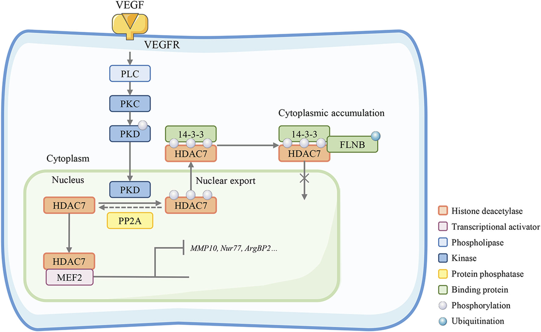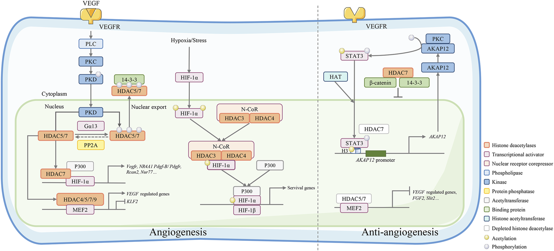 Class IIa HDACs play an important role in angiogenesis regulation. VEGF binds to VEGFR and activates its downstream phospholipase C (PLC)-protein kinase C (PKC)-protein kinase D (PKD) signaling. The activated kinase PKD phosphorylates HDAC7 to activate 14-3-3 binding sites and resulting in the export of HDAC7 to the cytoplasm. Conversely, phosphorylated IIa HDACs can be dephosphorylated by protein phosphatase 2A (PP2A) and regulate gene expression by forming a complex with HIF-1α and acetyltransferase p300 or a complex with MEF2. Under hypoxic/stressful conditions, the HDAC4/N-CoR/HDAC3 complex binds to hypoxia-inducible factor (HIF)-1α and represses basal transcription in endothelial cells. HDAC7 depletion in endothelial cells leads to repressed migration and tube formation with overexpression of A-kinase anchor protein 12 (AKAP12). AKAP12 interacts with PKC and phosphorylates transducer and activator of transcription 3 (STAT3). Phosphorylated STAT3 increasingly binds to H3 histones associated with the AKAP12 promoter, thus increasing the mRNA and protein levels of AKAP12. In the cytoplasm, HDAC7 can also bind the 14-3-3 protein and β-catenin to stabilize β-catenin, which stagnates HDAC7 in the nucleus and inhibits endothelial cell growth.