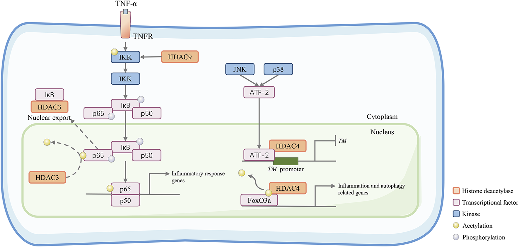 Class IIa HDACs promote inflammatory and atherosclerotic disease progression. HDAC9 activates the inhibitory kappa B kinase/nuclear factor-kappa B (IKK/NF-κB) pathway to induce vascular inflammation. HDAC9 reduces IKK acetylation. This results in reduced IKK activity, increased p65 phosphorylation, and increased proinflammatory responses in HUVECs. HDAC3 can deacetylate the NF‐κB subunit p65, which promotes its nuclear export. In the C-Jun N-terminal kinase (JNK) and p38 pathways, ATF-2 can recruit HDAC4 and bind to the TM promoter to form a transcriptional repression complex, which may diminish the gene transcription of the TM gene, an important vascular protective molecule in anti-inflammation. In addition, HDAC4 deacetylates the transcription factor forkhead box O3a (FoxO3a) allowing it to act to increase the transcriptional activity of autophagy- and inflammation-related genes.