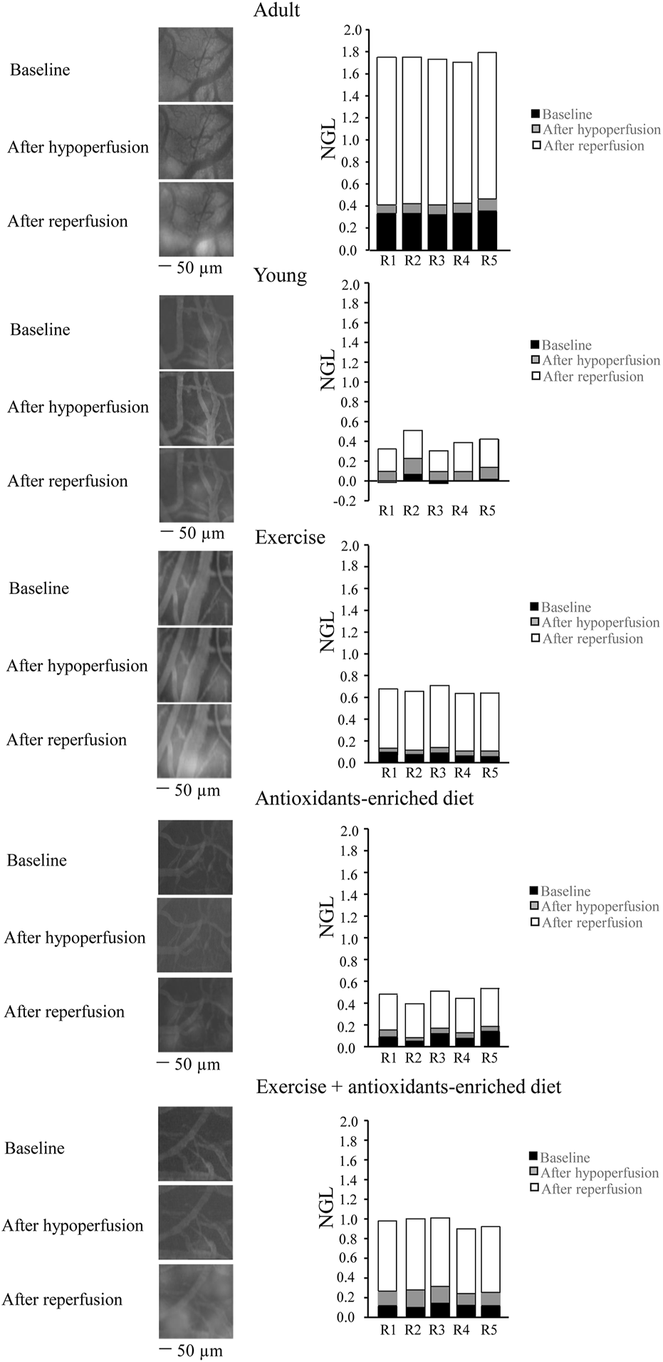 Reactive oxygen species (ROS) formation was evaluated in vivo by DCF fluorescence intensity measured by normalized gray levels (NGL) in baseline conditions (n = 3) and after 60 min of reperfusion (n = 3) in the different experimental groups. Right reports the graphs showing the variations in each animal of each experimental group (R9–R11). Left reports the corresponding video images of the pial microcirculation obtained with a fluorescence microscope in a SHR rat belonging to each experimental group.