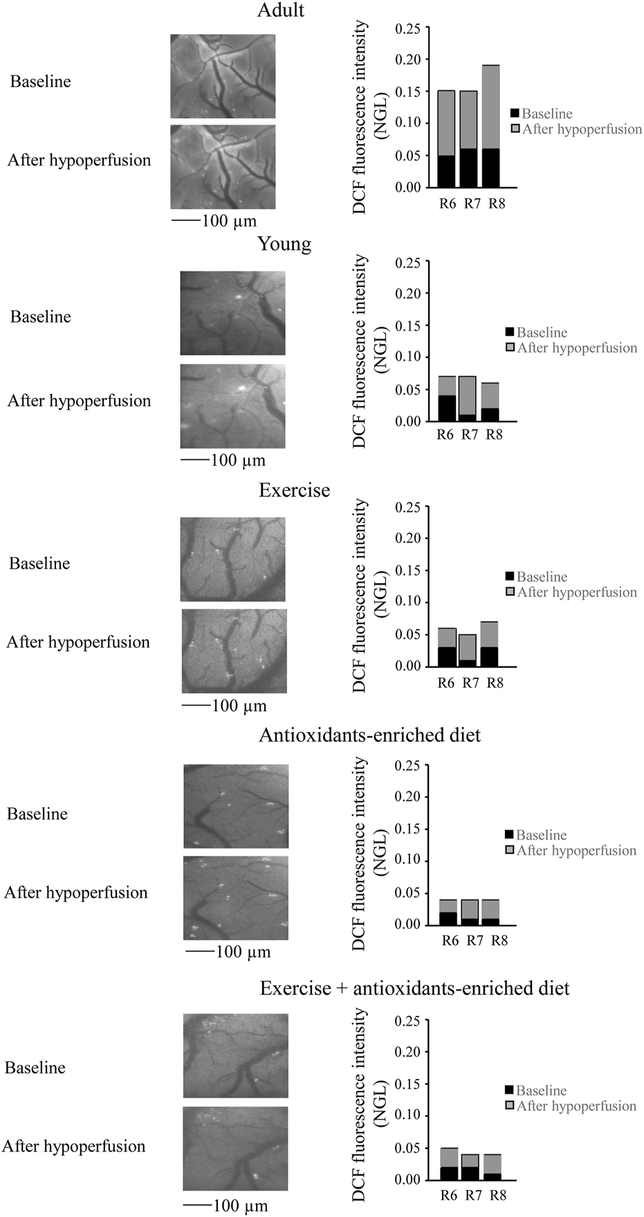 Reactive oxygen species (ROS) formation was evaluated in vivo by DCF fluorescence intensity measured by normalized gray levels (NGLs) in baseline conditions (n = 3), after 30 min of hypoperfusion (n = 3). Right reports the graphs showing the variations in each animal of each experimental group (R6–R8). Left reports the corresponding video images of the pial microcirculation obtained with a fluorescence microscope in a SHR rat belonging to each experimental group.