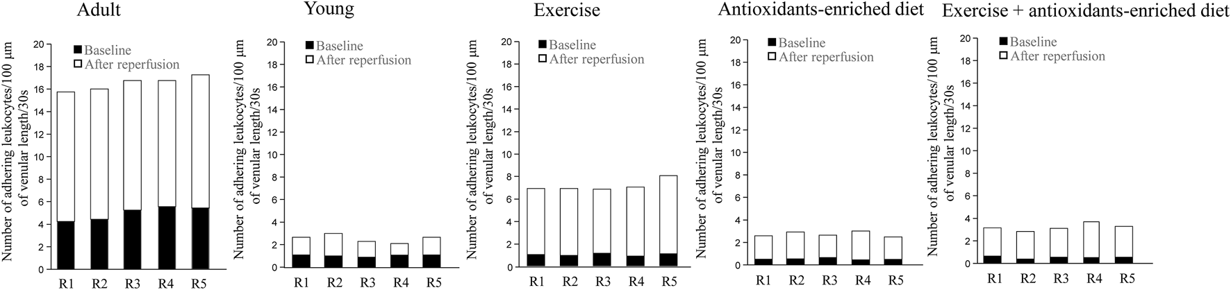 Leukocyte adhesion quantified by the number of leukocytes adhering to venular walls in baseline conditions and at the end of reperfusion is shown for each animal in different experimental groups. n = 5 for each group.