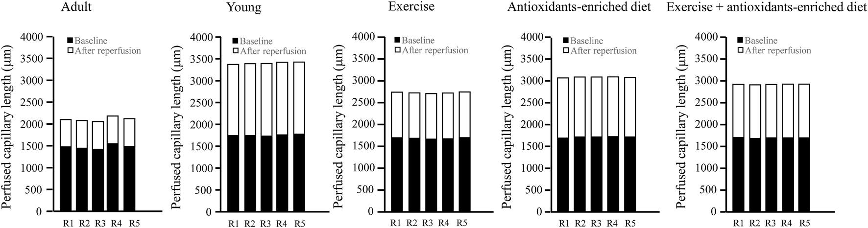 Supply of tissue blood flow was calculated as the length of the perfused capillaries in baseline conditions and after 60 min of reperfusion in the different experimental groups. The graphs showed the measure obtained in each animal in different experimental groups. n = 5 for each group.