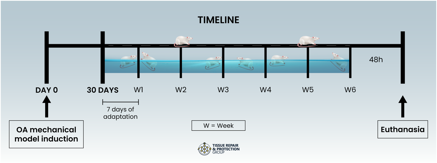 Thus, this study aimed to investigate and compare the effects of two types of physical exercises widely used in the literature (treadmill vs. swimming) in a mechanical model of osteoarthritis to better understand the effects of these different modalities on the inflammatory response, oxidative stress markers and morphological variables present in OA.