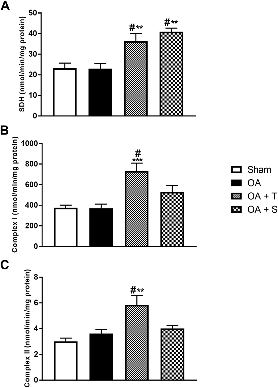 Figure 2 shows the levels of Succinate dehydrogenase (SDH) and complexes I and II of the electron transport chain (ETC). In Figure 2A, it is observed a significant increase in SDH in the OA + T and OA + S groups compared to the Sham group (p < 0.05). It is also possible to observe a statistical difference between the two, OA + T and OA + S, in relation to the OA group (p < 0.01). In Figure 2B it is observed a significant increase in the activity of complex I in the OA + T group compared to the Sham group (p < 0.05) and in relation to the OA group (p < 0.001). In Figure 2C, it is observed a significant increase in the activity of complex II in the OA + T group compared to the Sham group (p < 0.05) and in relation to the OA group (p < 0.01).
