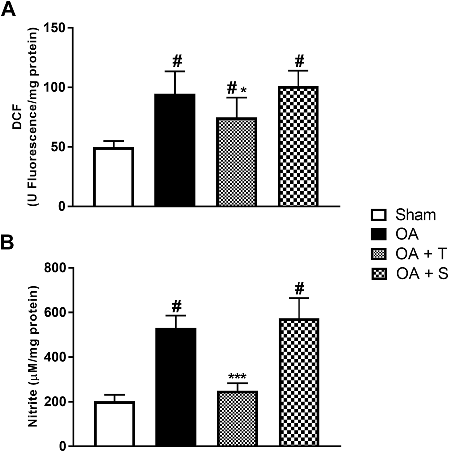 In Figure 3A it is observed a significative elevation of DCF in OA, OA + T, and OA + S groups in relation to Sham, while OA + T showed a significant reduction when compared to the OA group (p < 0.05). In Figure 3B, nitrite levels showed significant increases in the OA and OA + S groups when compared to Sham, while the OA + T group showed a significant reduction in nitrite concentrations when compared to the OA group (p < 0.001).