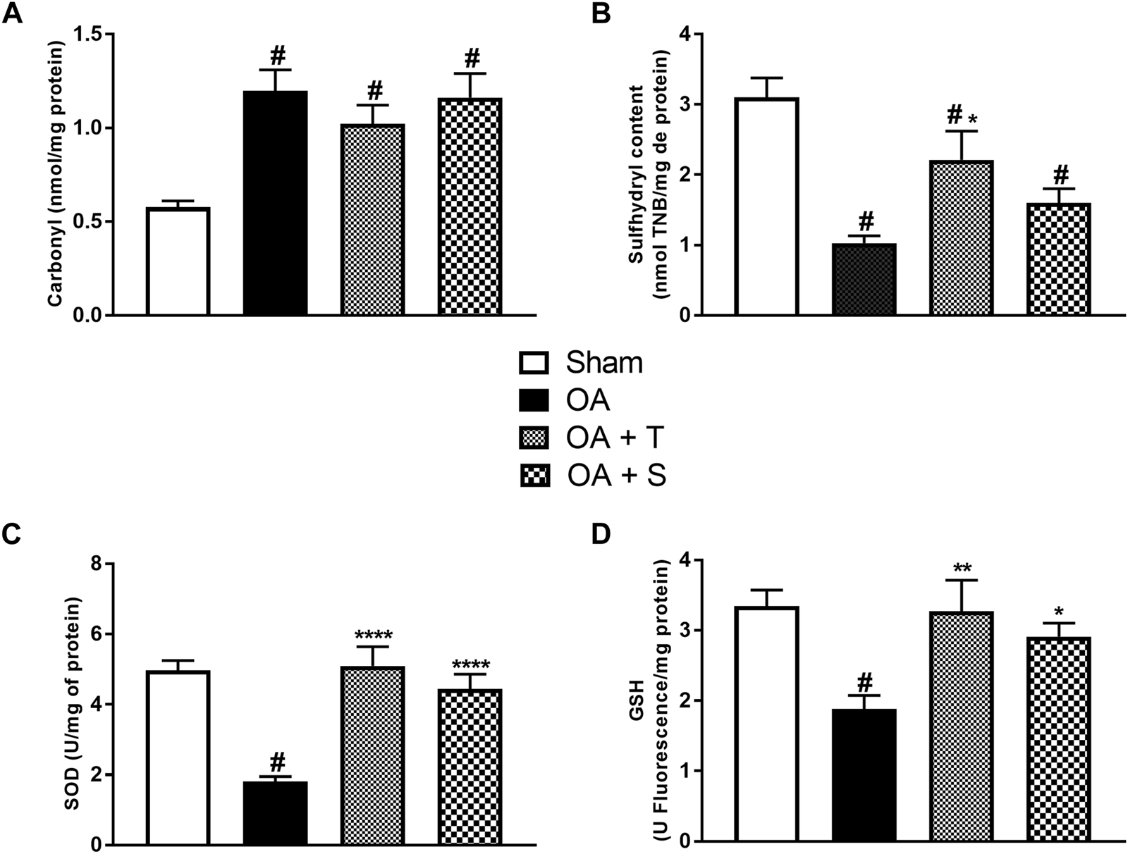 To assess oxidative damage, carbonyl levels and sulfhydryl content were analyzed (Figure 4). In 4A it is observed a significant increase of carbonyl was in the OA, OA + T, and OA + S groups in relation to the Sham group (p < 0.05). In 4B it is observed a significant reduction of sulfhydryl in the OA, OA + T, and OA + S groups in relation to the Sham group, while the OA + T group showed a significant increase when compared to the OA group (p < 0.05).